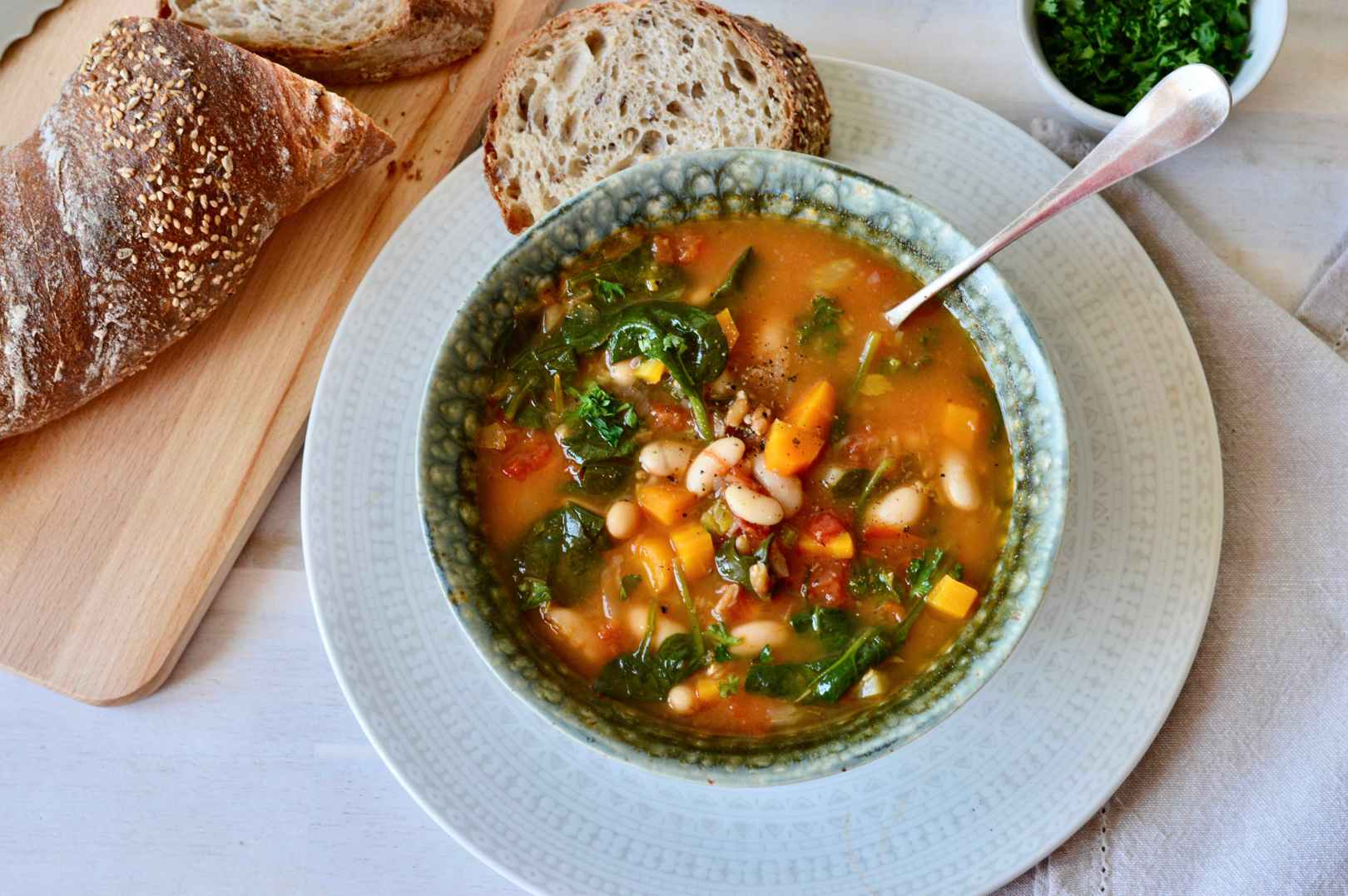 This soup is a variation of the Tuscan bean soups from the Tuscany region of Italy. Along with cooked white beans, I made it with onion, carrots, celery, garlic, farro, ripe tomatoes and tomato pulp, herbs and lots of fresh spinach.