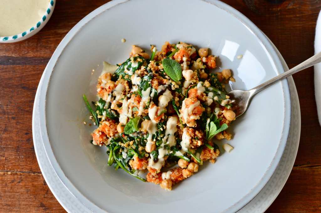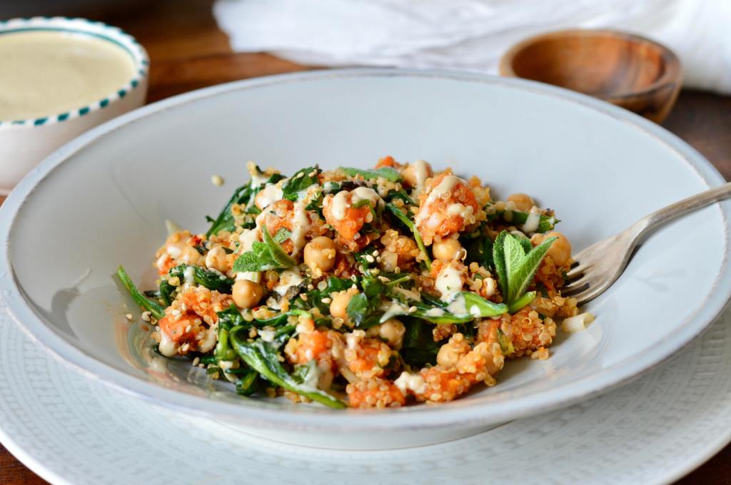 This quinoa with roasted sweet potato, chickpeas and spinach (or kale) is a delicious meal that is full of whole grain, vegetables and legumes. It will give you all the plant protein, vitamins, minerals, antioxidants, fibre and carbohydrates that your body needs.