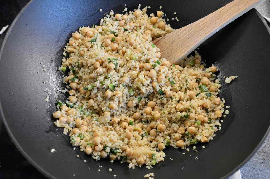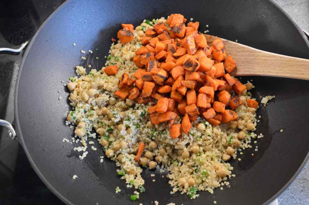 7. Lower or adjust heat and add the cooked quinoa and toss.