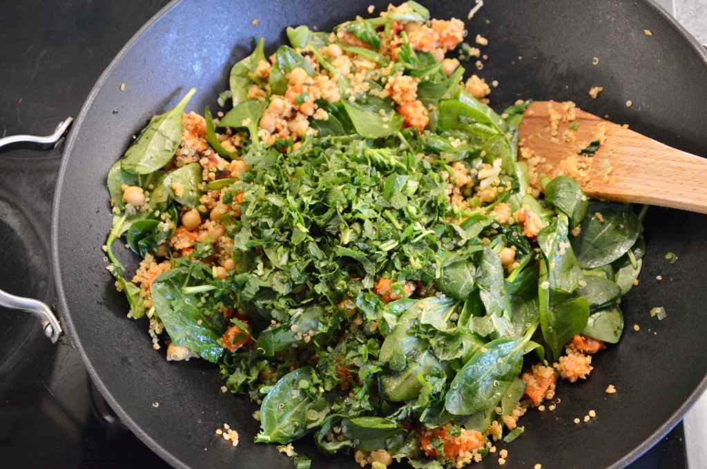 9. Add the baby spinach or kale and keep tossing. In a few minutes the leaves will begin to wilt.