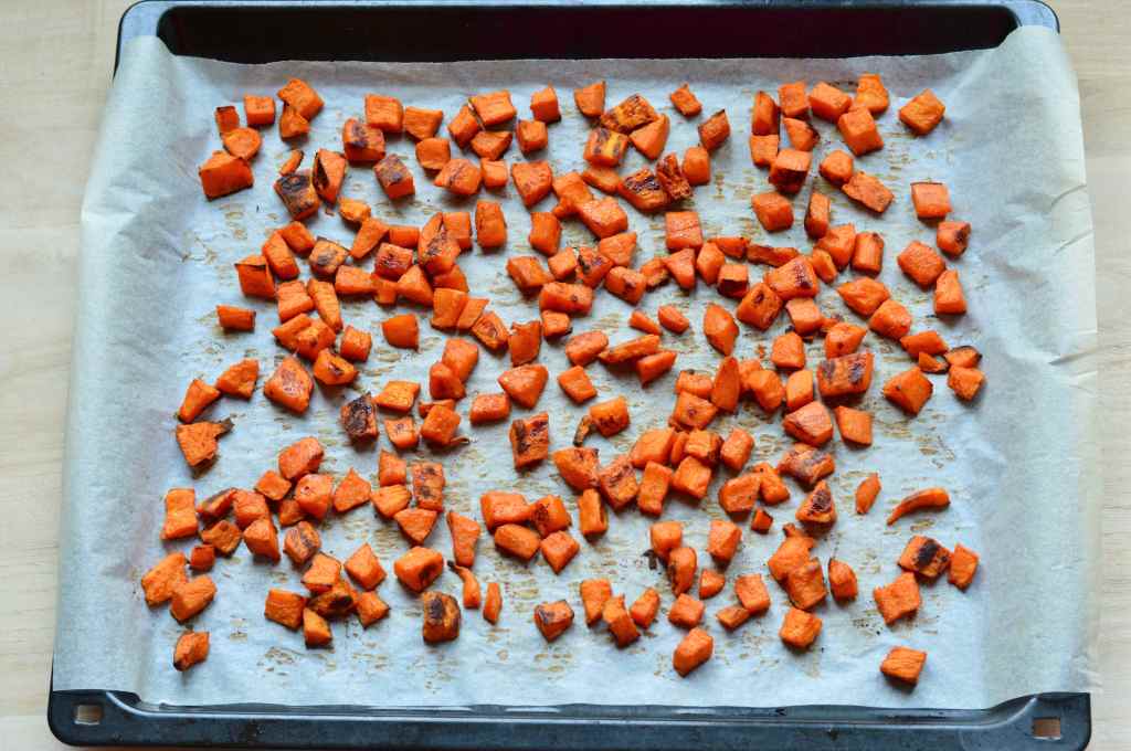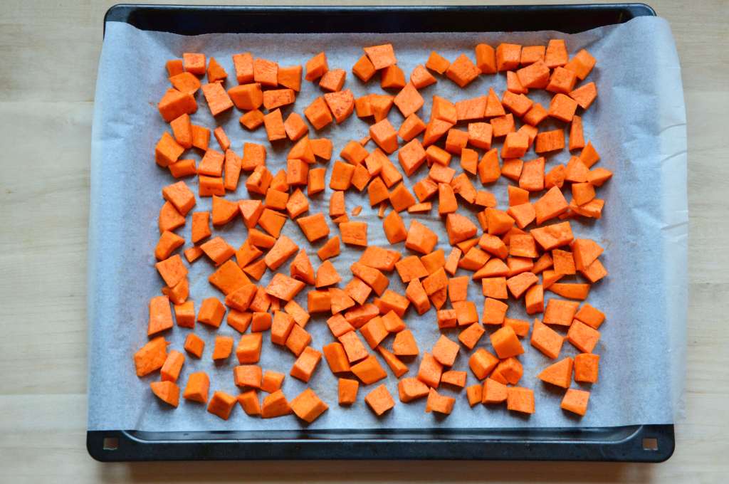 3. Pre-heat oven to 210°C / 410°F. Transfer the sweet potato cubes into a bowl and drizzle them with olive oil (about 1 tablespoon). Then, add 1/2 teaspoon cumin, 1 teaspoon paprika, a pinch of cayenne and salt. Toss with clean hands to coat the potatoes all over.