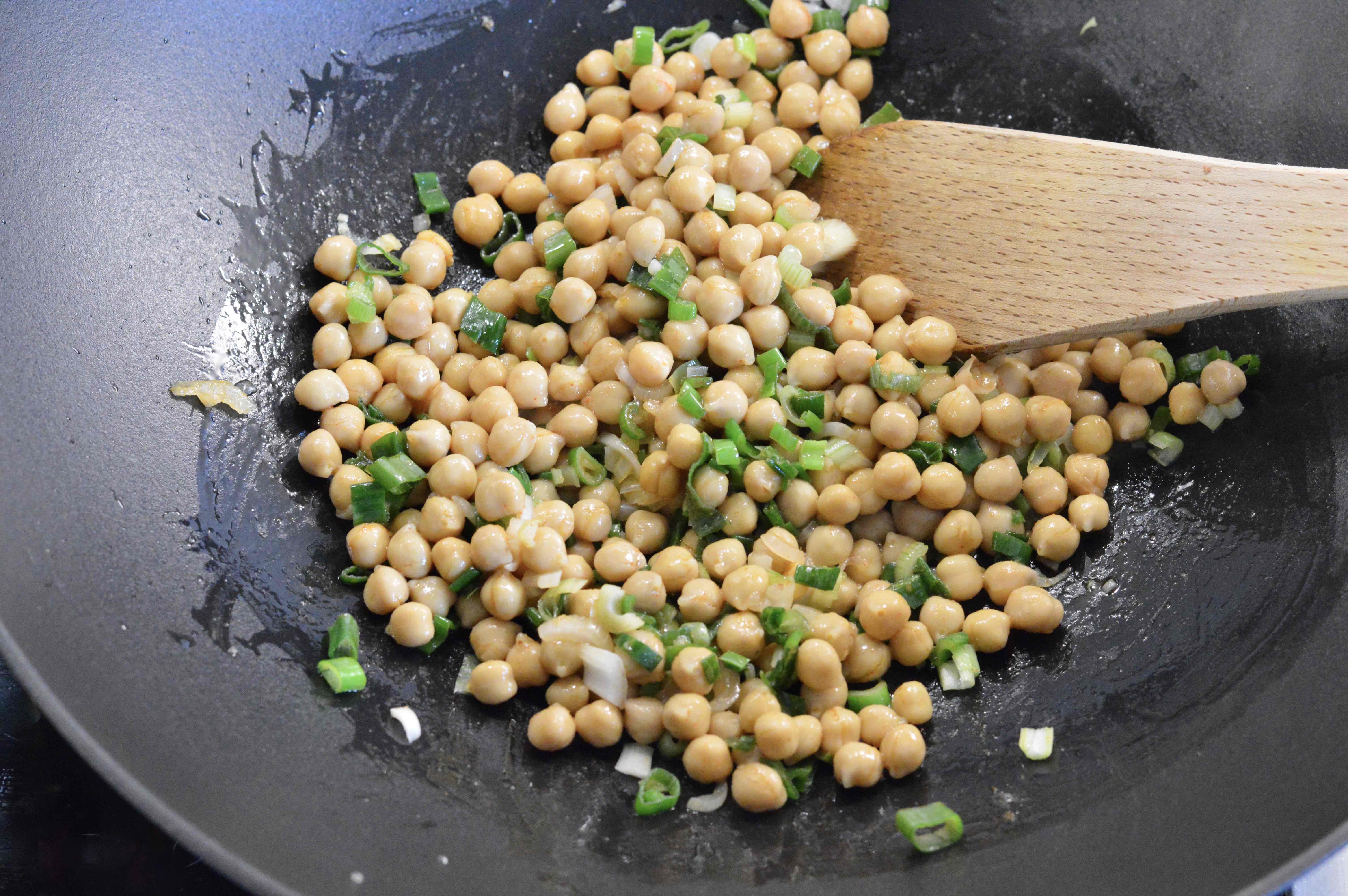 6. On medium-high heat on stove top, heat up 2 tablespoons of olive oil in a large non-stick pan or wok. When the olive oil shimmers, reduce the heat to medium and add the green onion and chickpeas. Toss for 2 minutes.