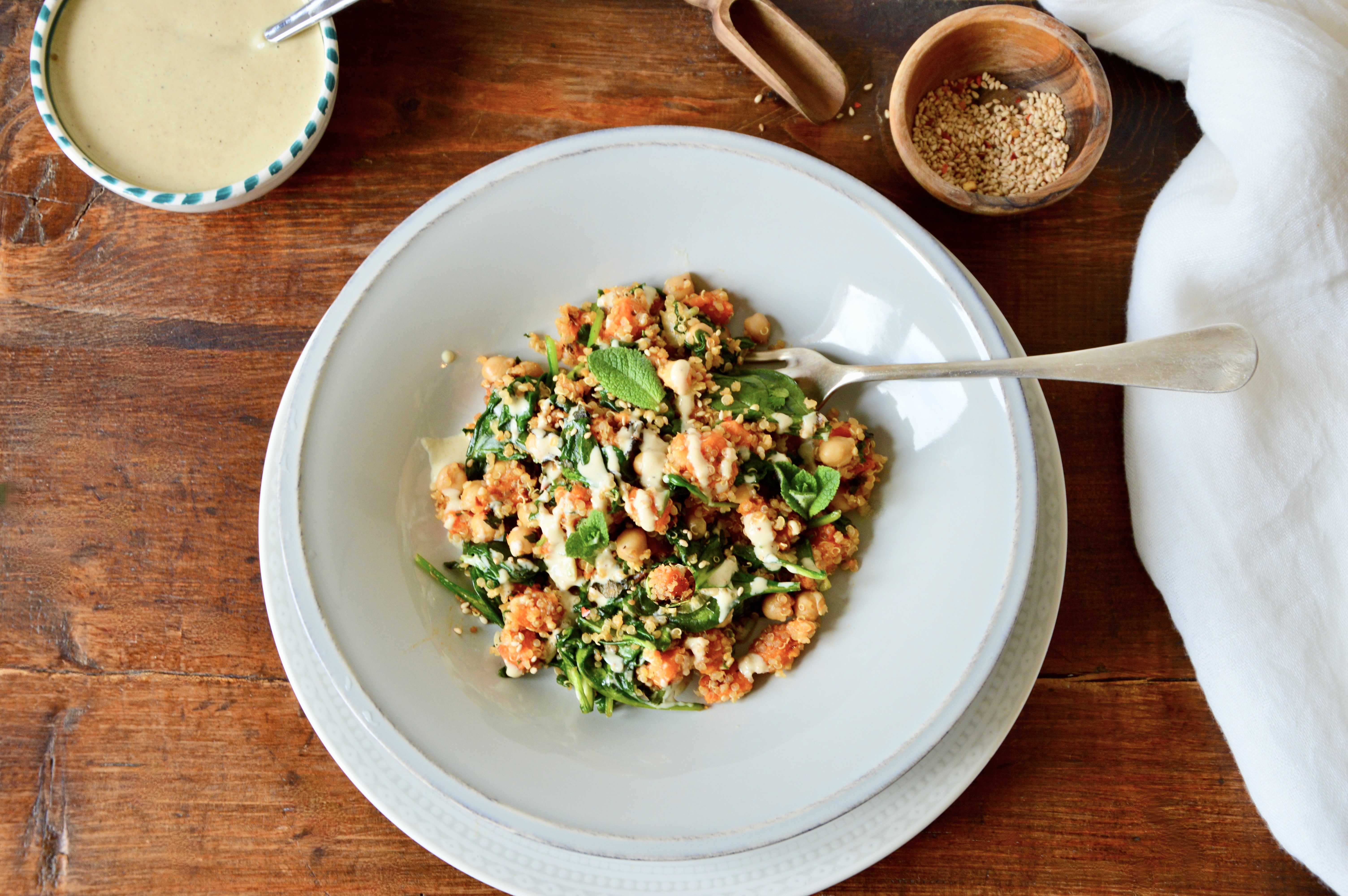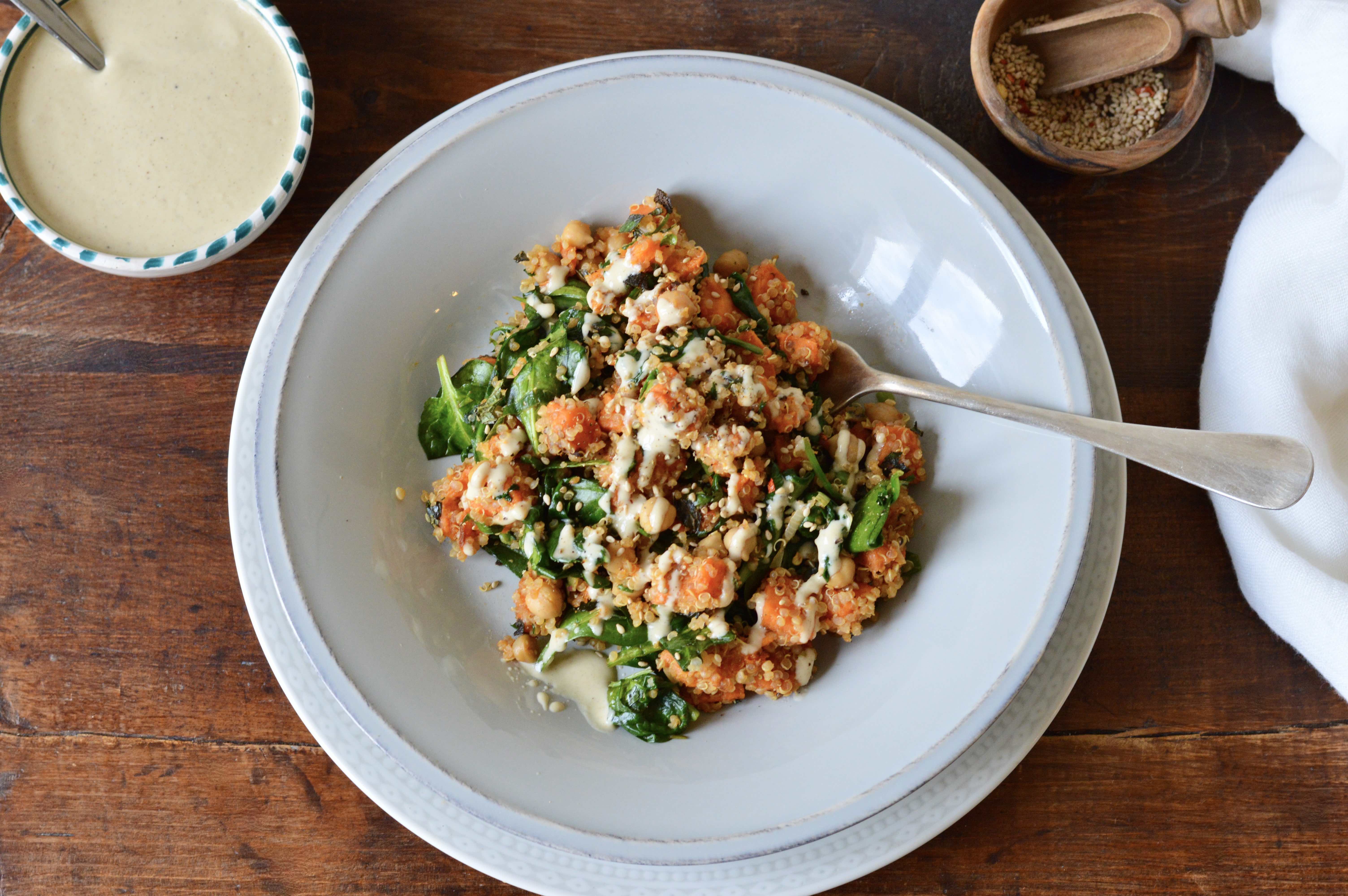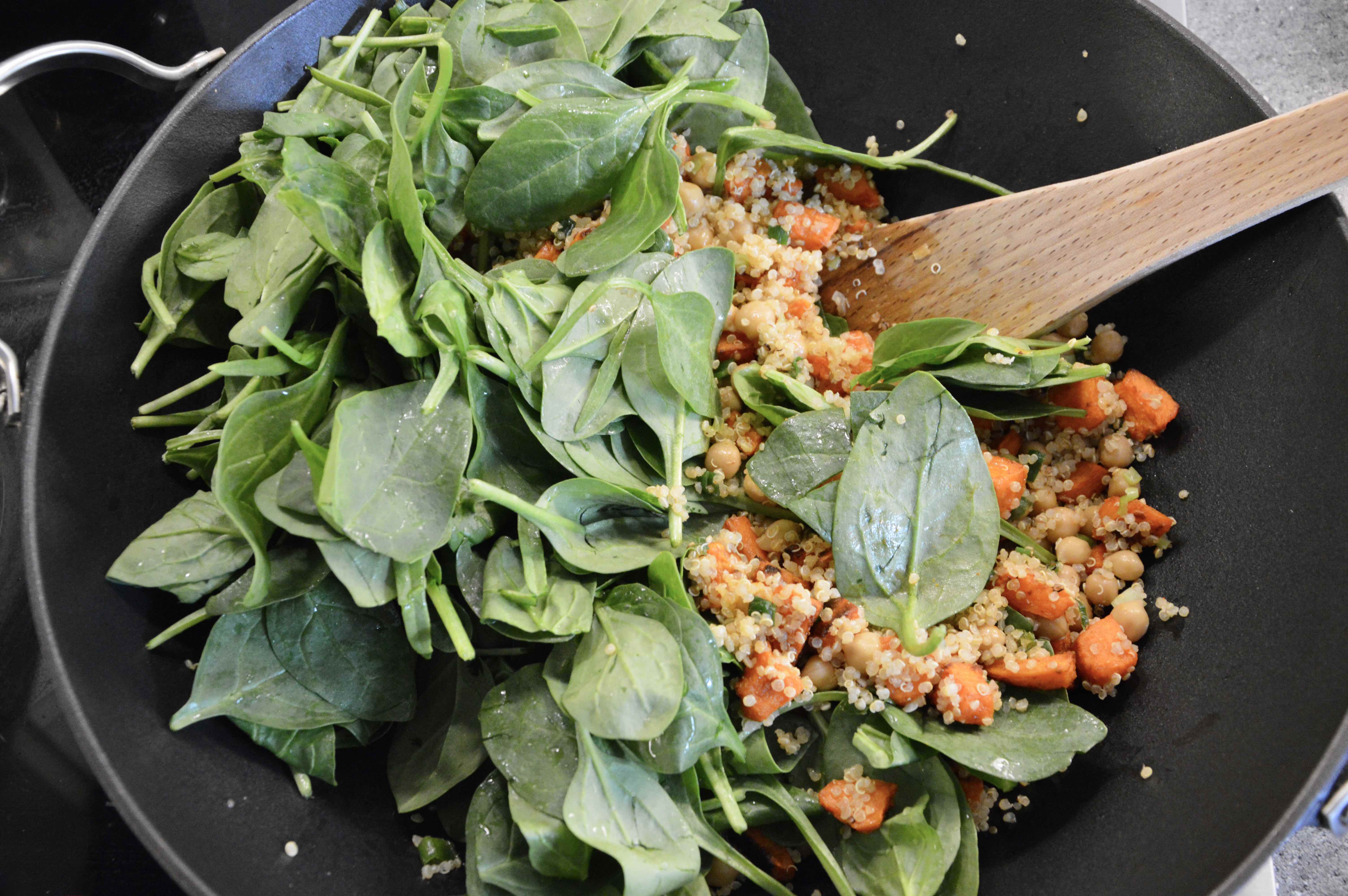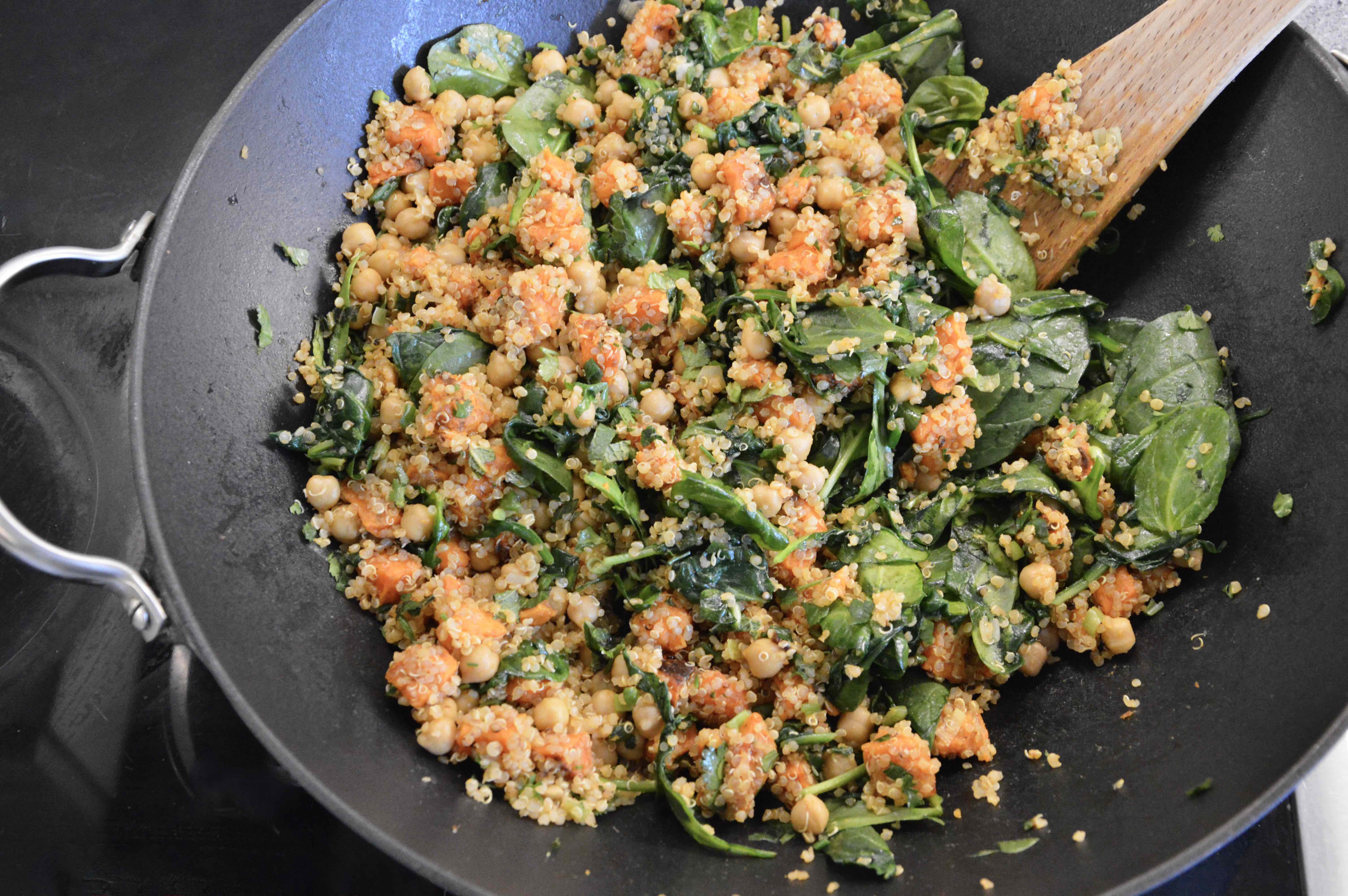This quinoa with roasted sweet potato, chickpeas and spinach (or kale) is a delicious meal that is full of whole grain, vegetables and legumes. It will give you all the plant protein, vitamins, minerals, antioxidants, fibre and carbohydrates that your body needs.