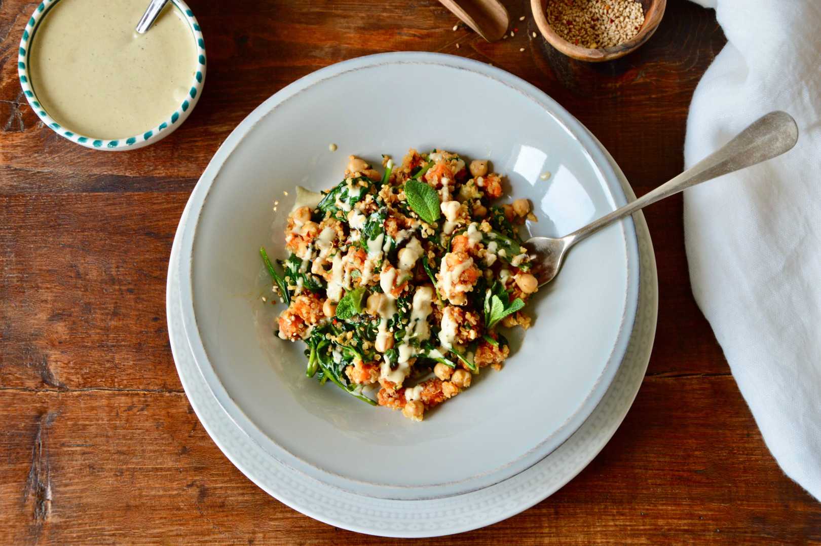 - Options: top portions with roasted sesame seeds, dry red pepper flakes and tahini dressing (recipe below)