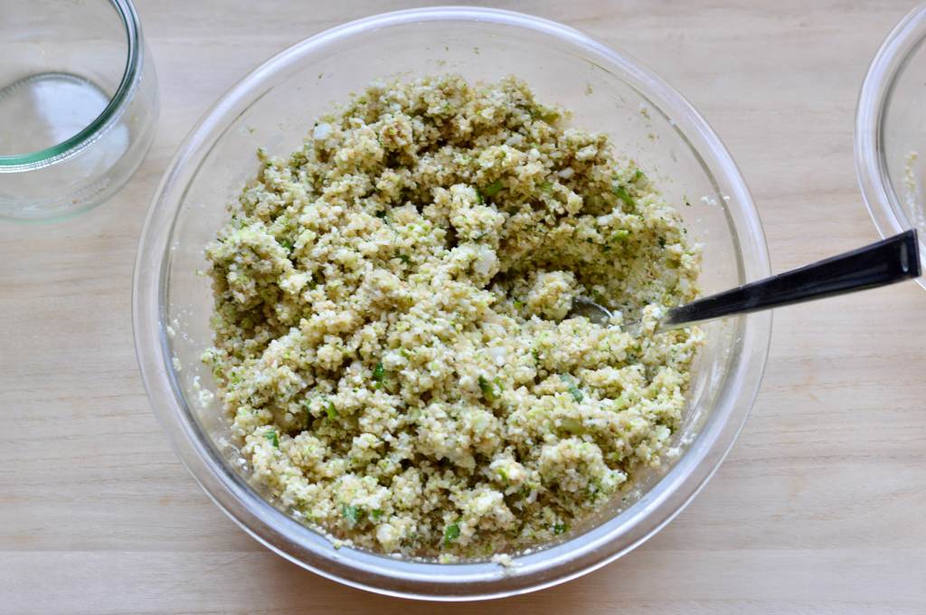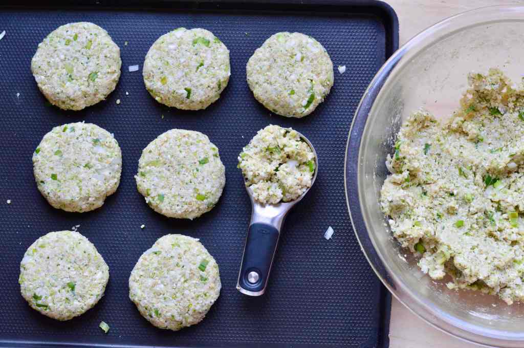 In this recipe you don’t need to steam or roast the cauliflower, broccoli, green pepper or onion. The veggies are kept raw. Once combined with cooked quinoa, silken tofu, the binding ingredients and seasonings, the mixture marinates and thickens. You can then make patties and fry them until crispy on the outside and tender on the inside.