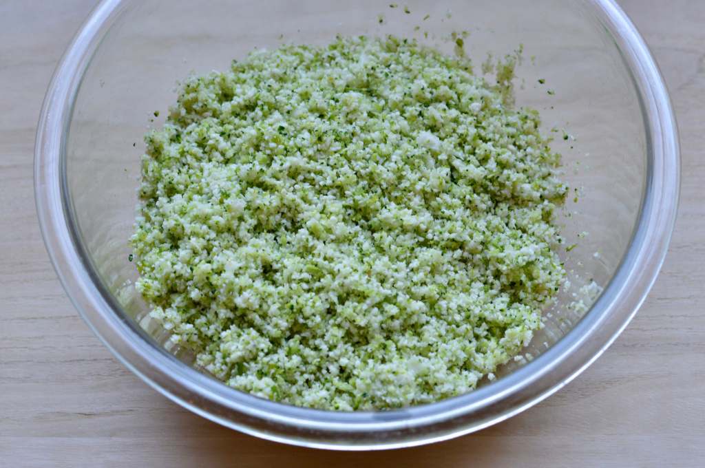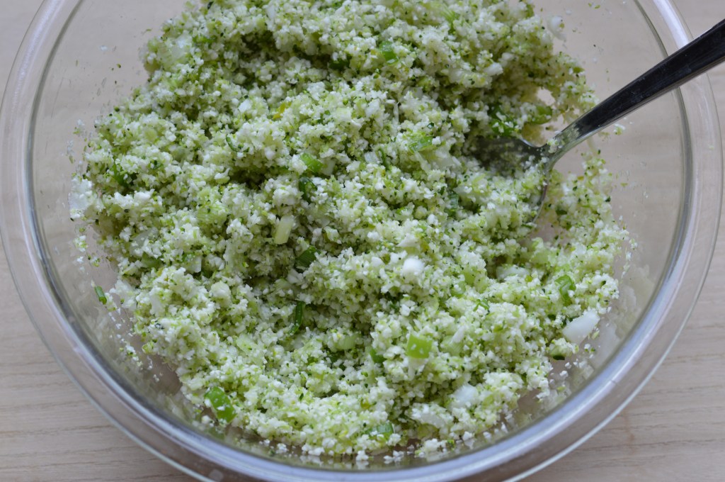 2. Add the chopped cauliflower, broccoli and jalapeño to your processor bowl. Pulse until you get a fine mince (not a paste). Then transfer into a bowl.