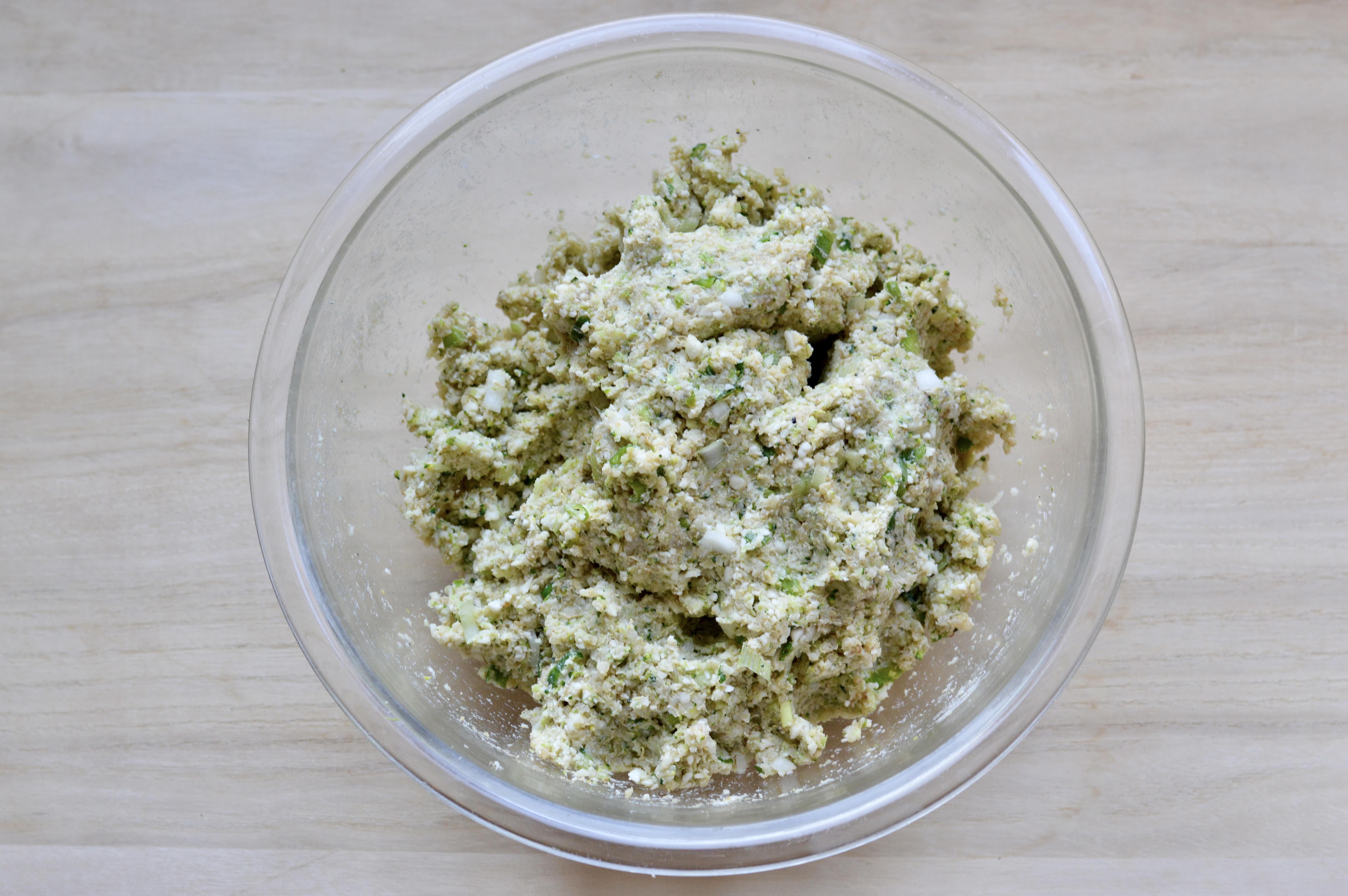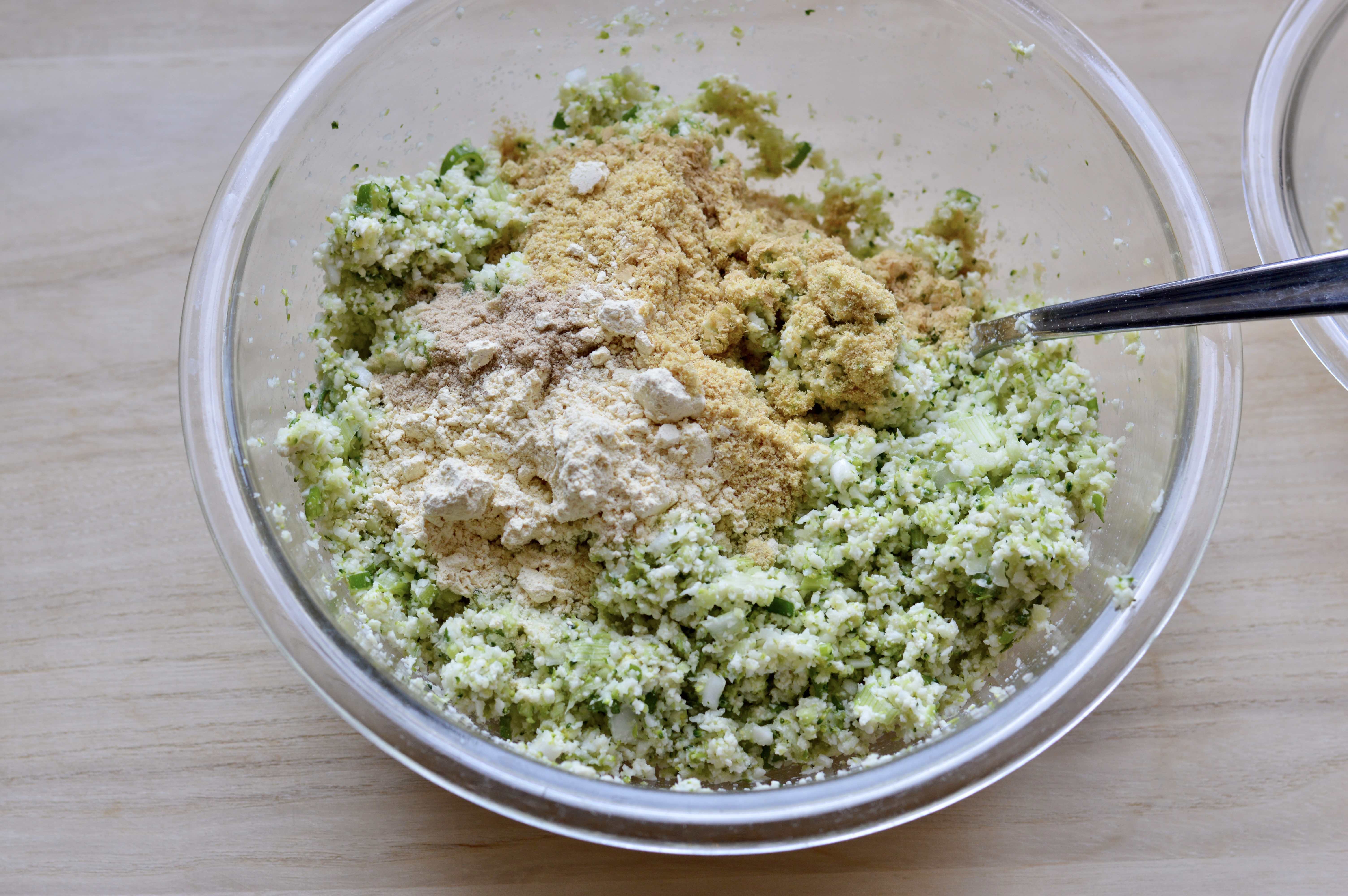 These cauliflower, broccoli and quinoa vegan patties are a delicious and nutritious alternative to traditional meat patties. The base is made with minced cauliflower, broccoli and a deseeded jalapeño green pepper. These 3 ingredients go into your food processor and are quickly pulsed into a mince. To the mince, I added and hand mixed some chopped green onion and pre-cooked quinoa.