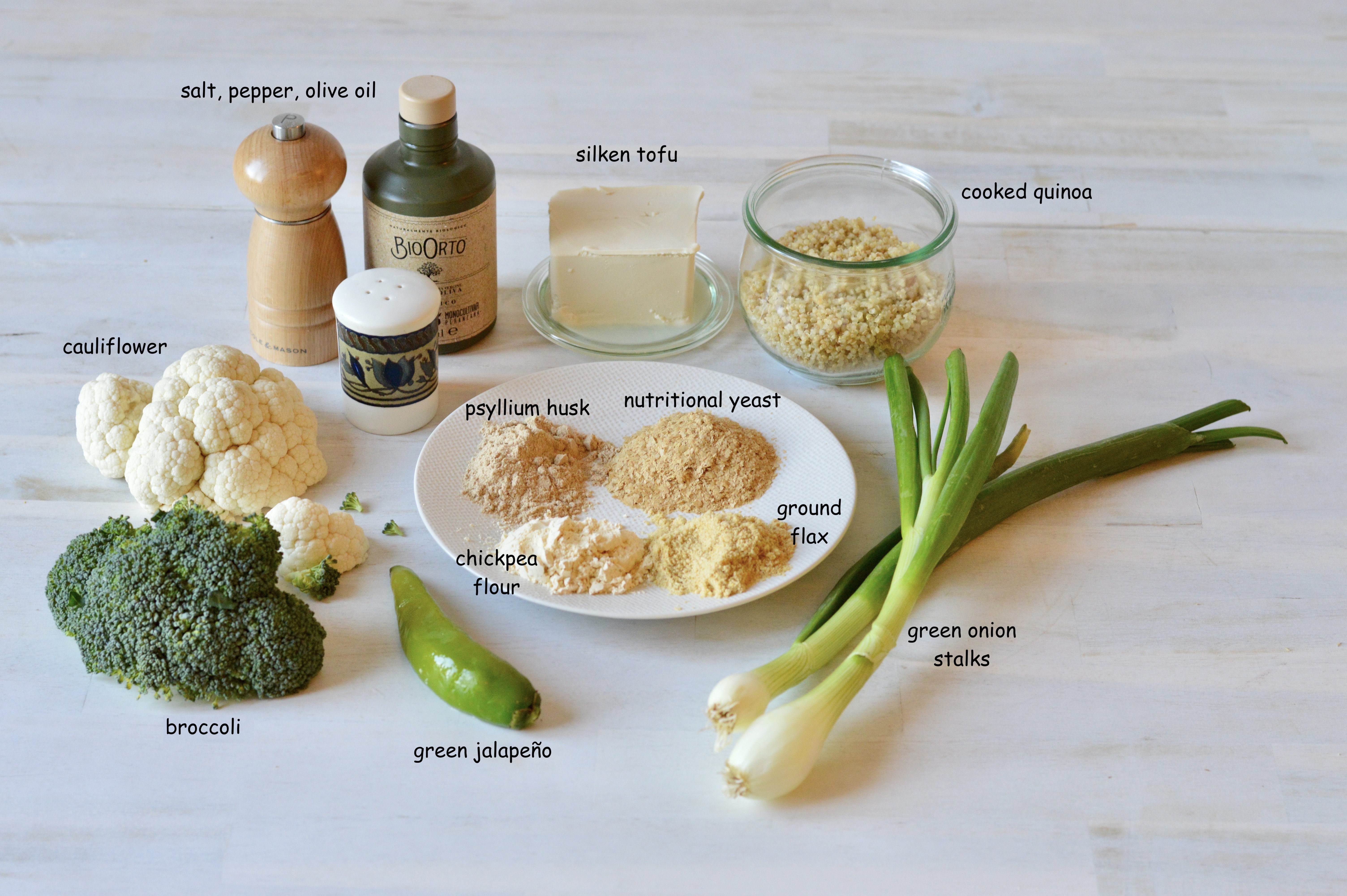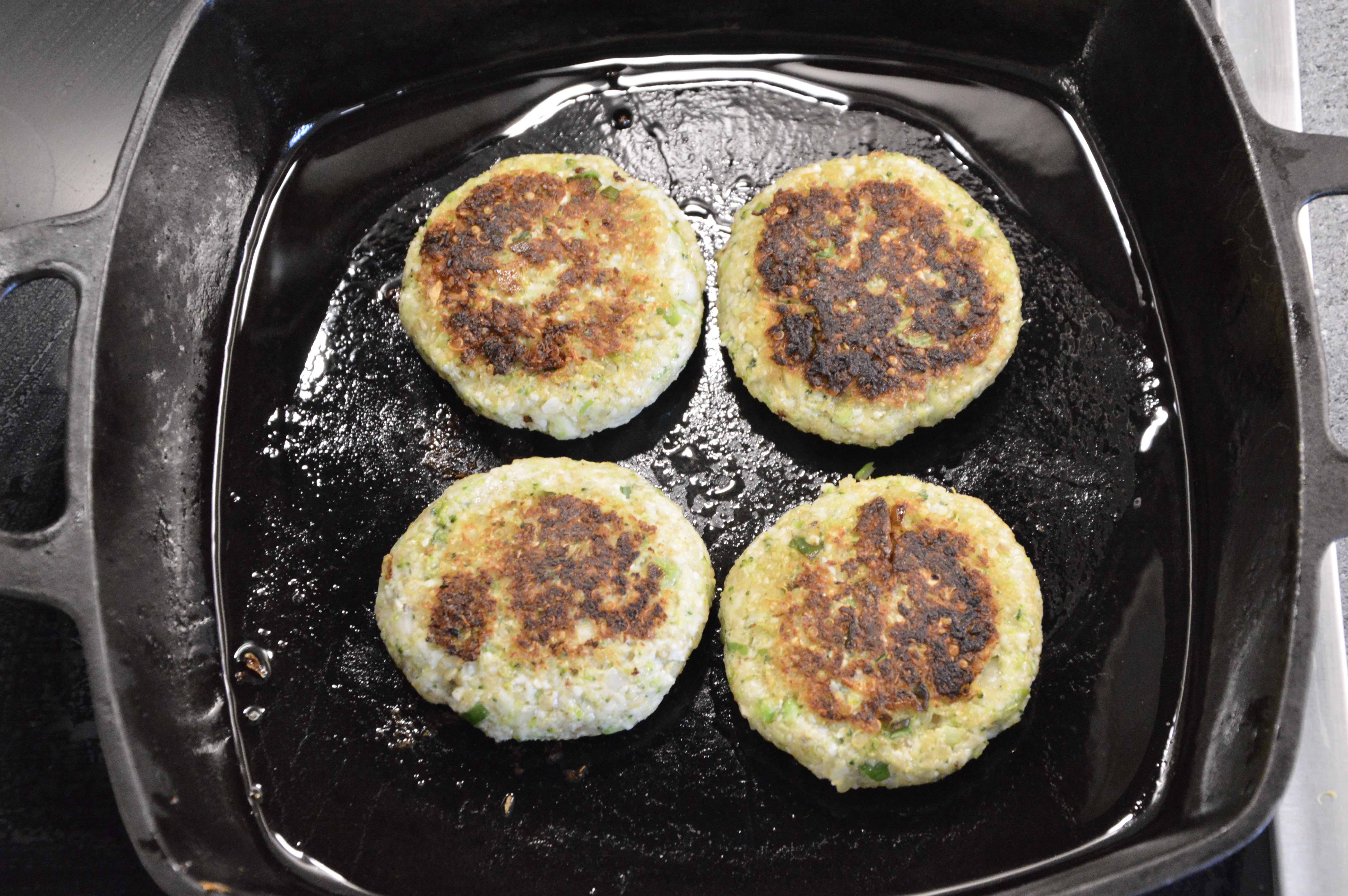 In this recipe you don’t need to steam or roast the cauliflower, broccoli, green pepper or onion. The veggies are kept raw. Once combined with cooked quinoa, silken tofu, the binding ingredients and seasonings, the mixture marinates and thickens. You can then make patties and fry them until crispy on the outside and tender on the inside.