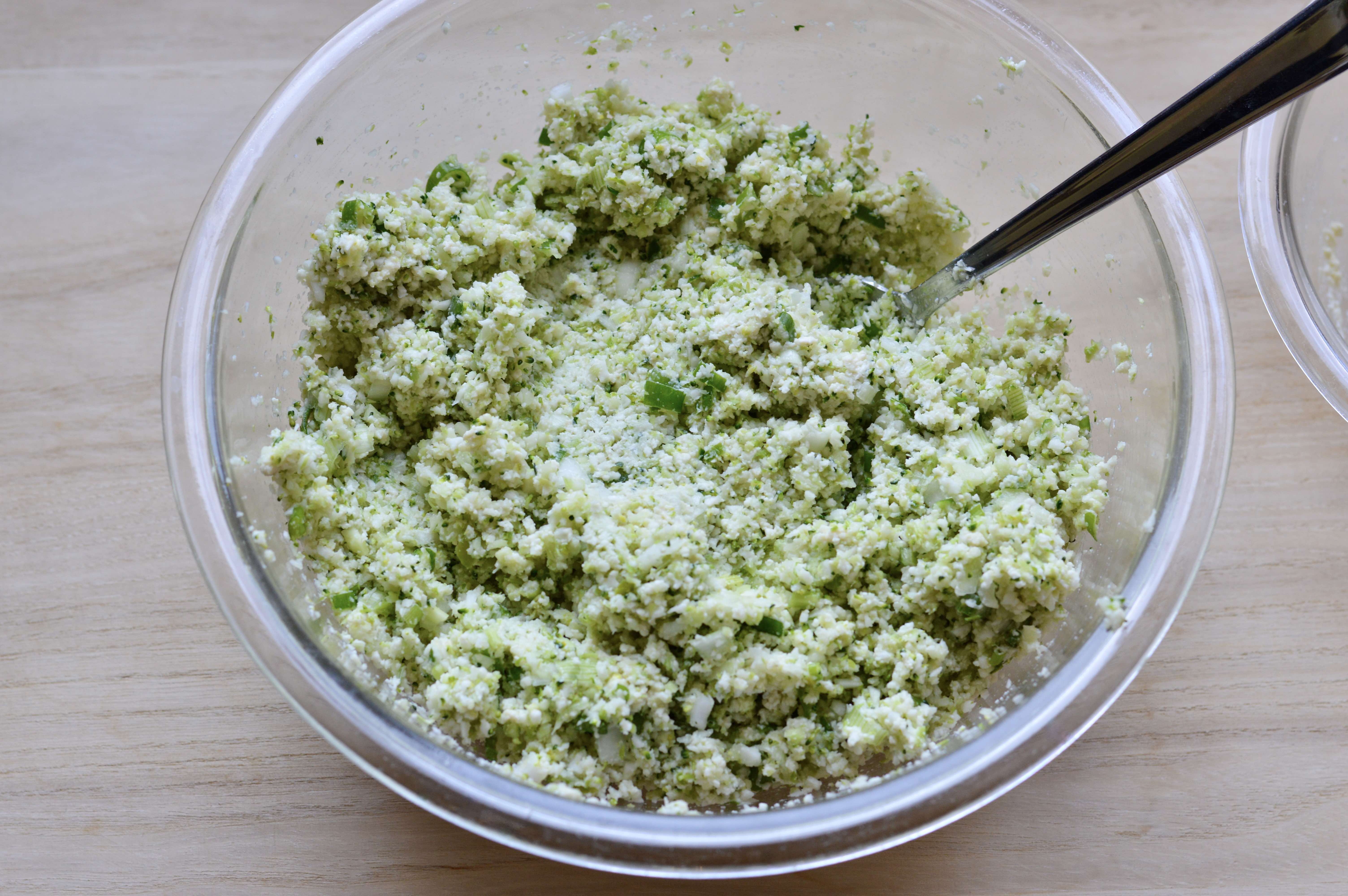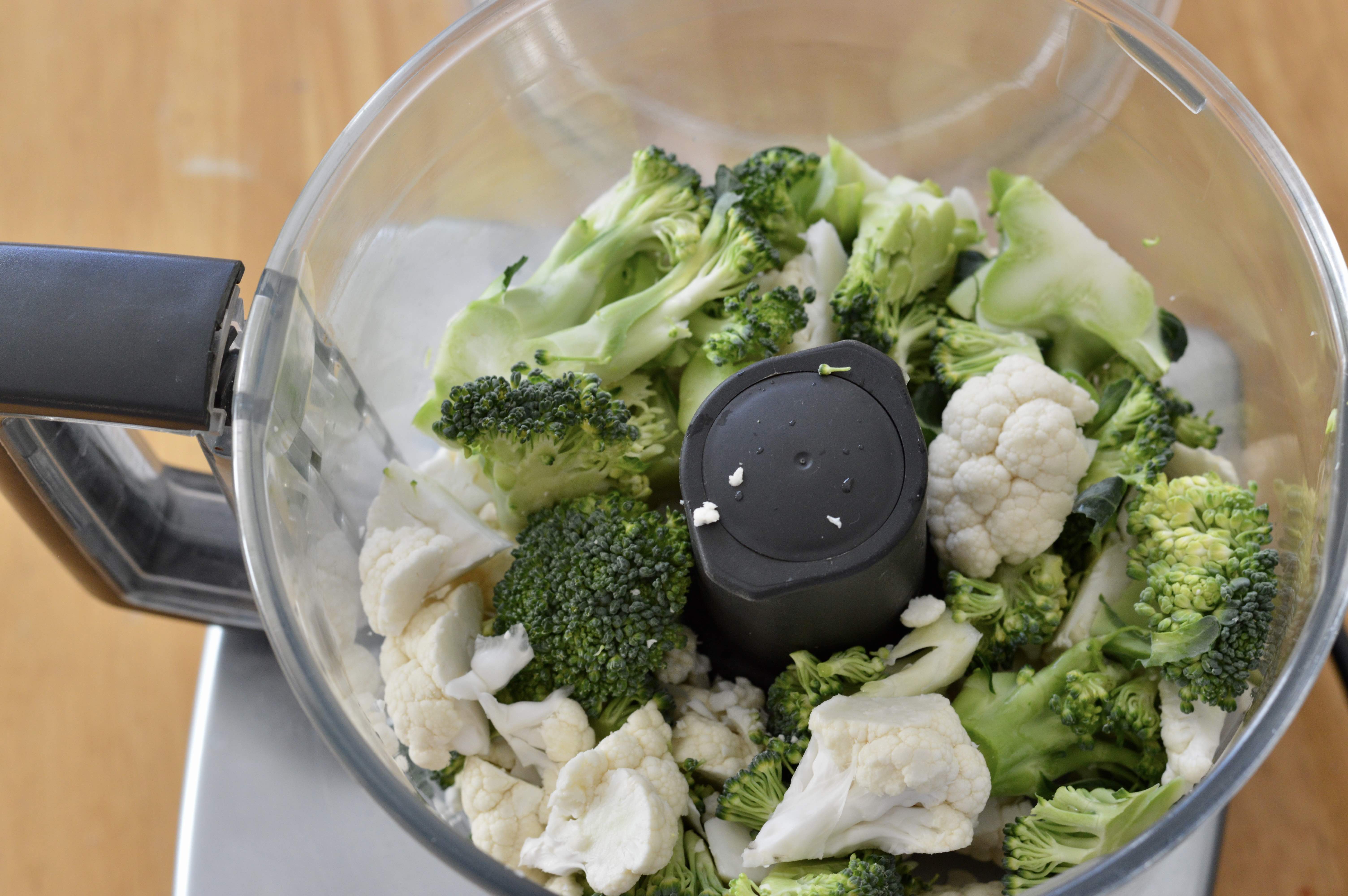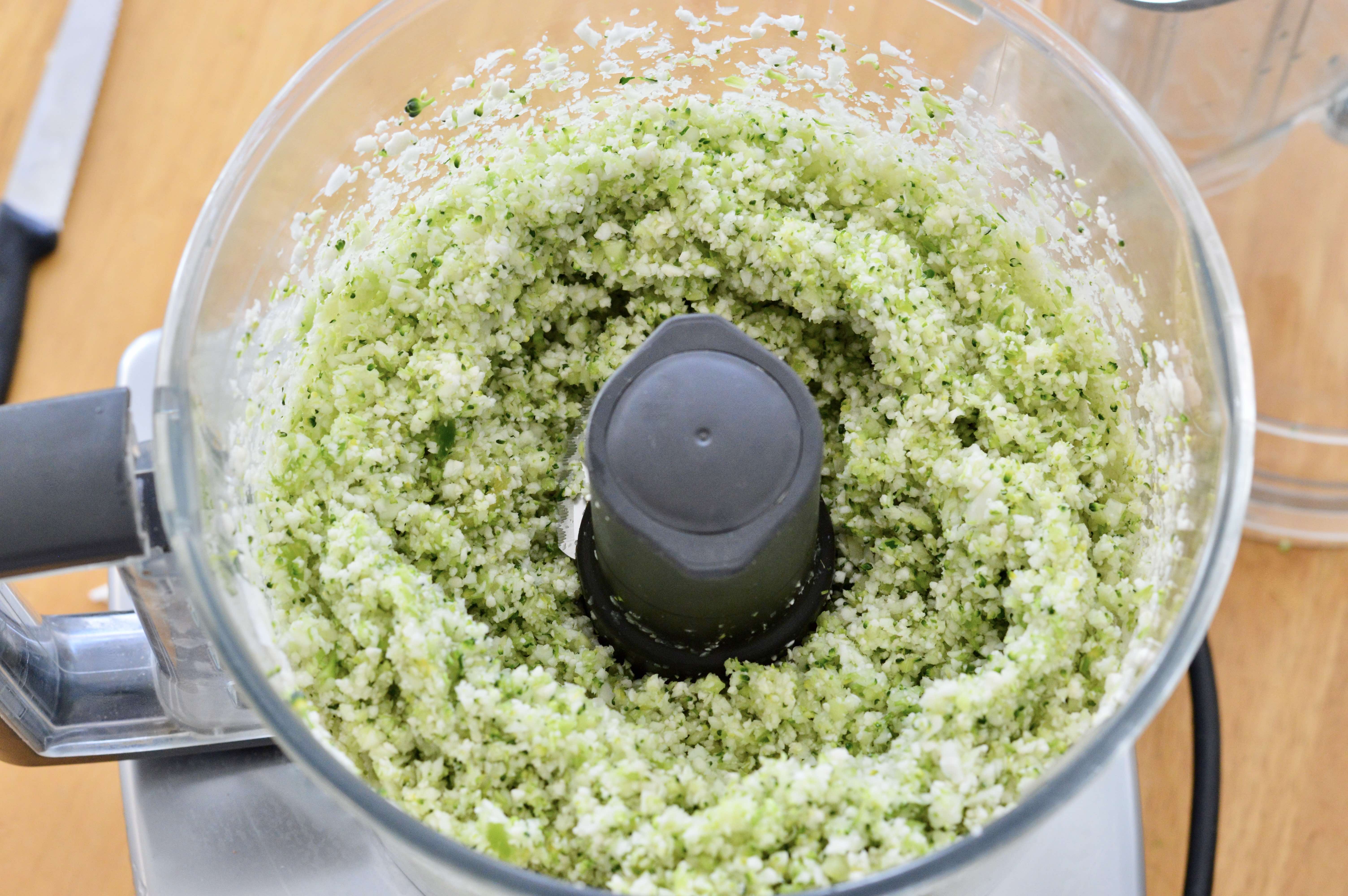2. Add the chopped cauliflower, broccoli and jalapeño to your processor bowl. Pulse until you get a fine mince (not a paste). Then transfer into a bowl.