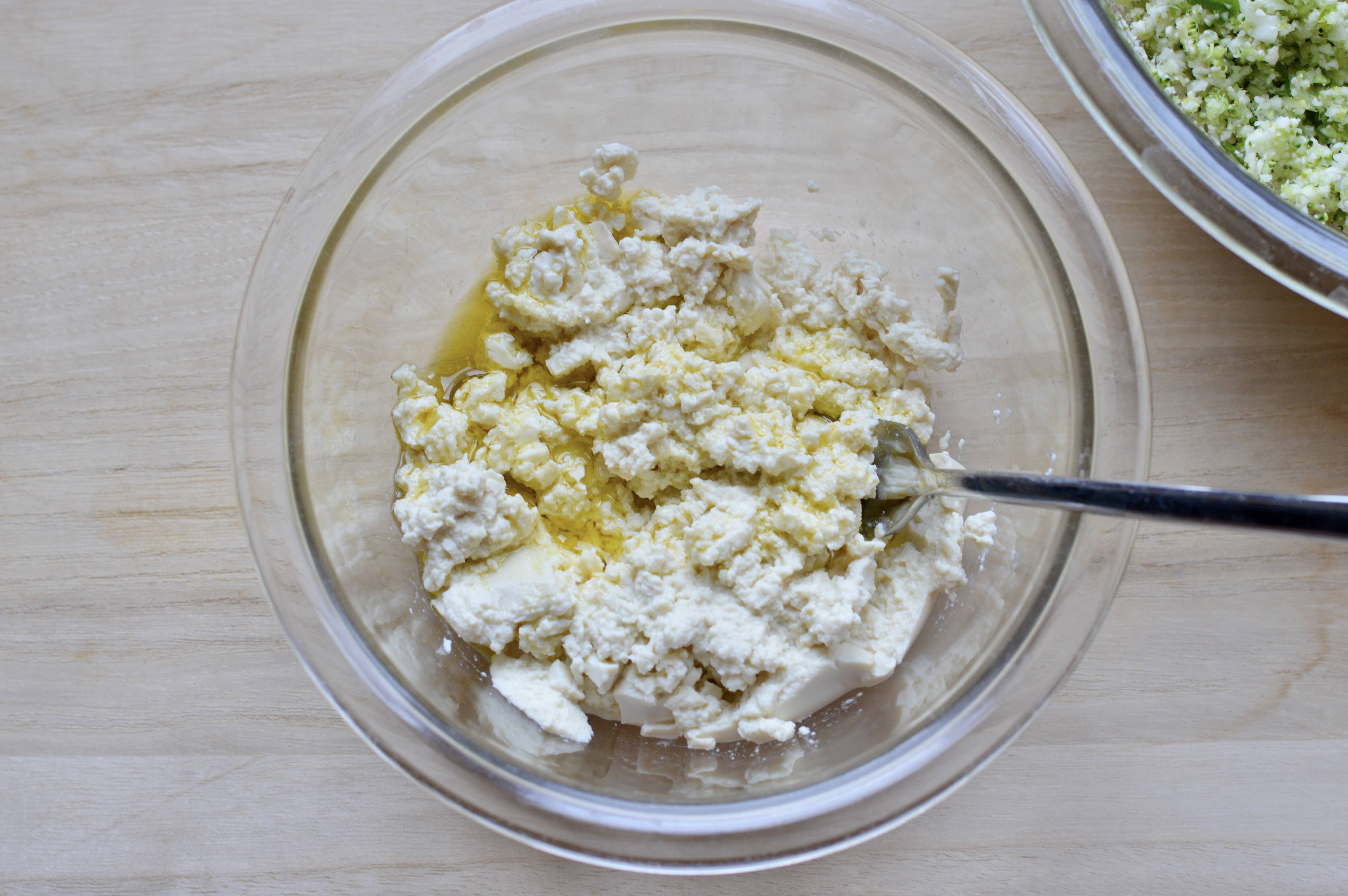 4. In a separate small bowl, add the silken tofu and 1 tbsp olive oil. Mash with a fork until blended & smooth.