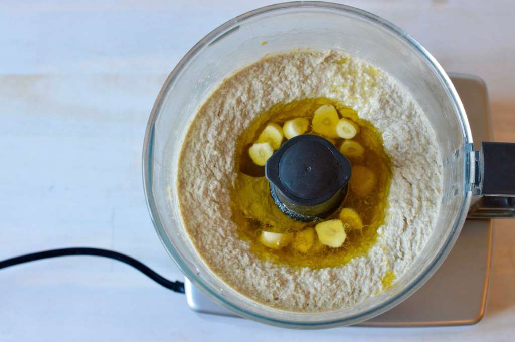 4. Add the lemon juice with olive oil and garlic and pulse for half a minute or so until combined, stopping and scraping sides if needed.