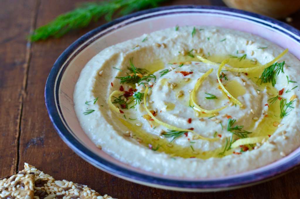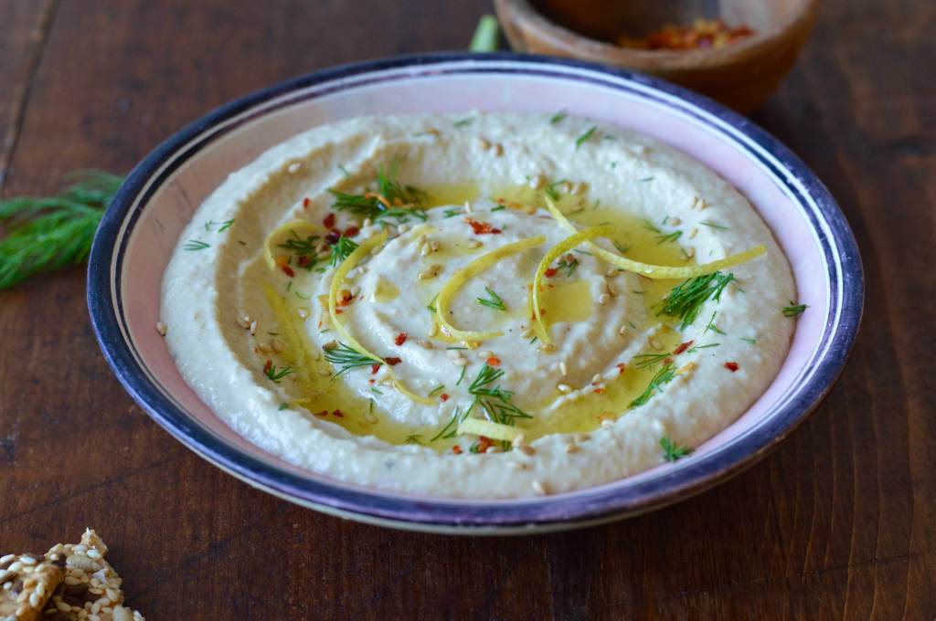 7. For serving, spoon some of the dip into a serving dish. If you want, make a shallow circular well with the back of a small spoon and drizzle some olive oil in it. Garnish as desired. Here I added roasted sesame seeds, red pepper flakes, some lemon peel slivers and dill.