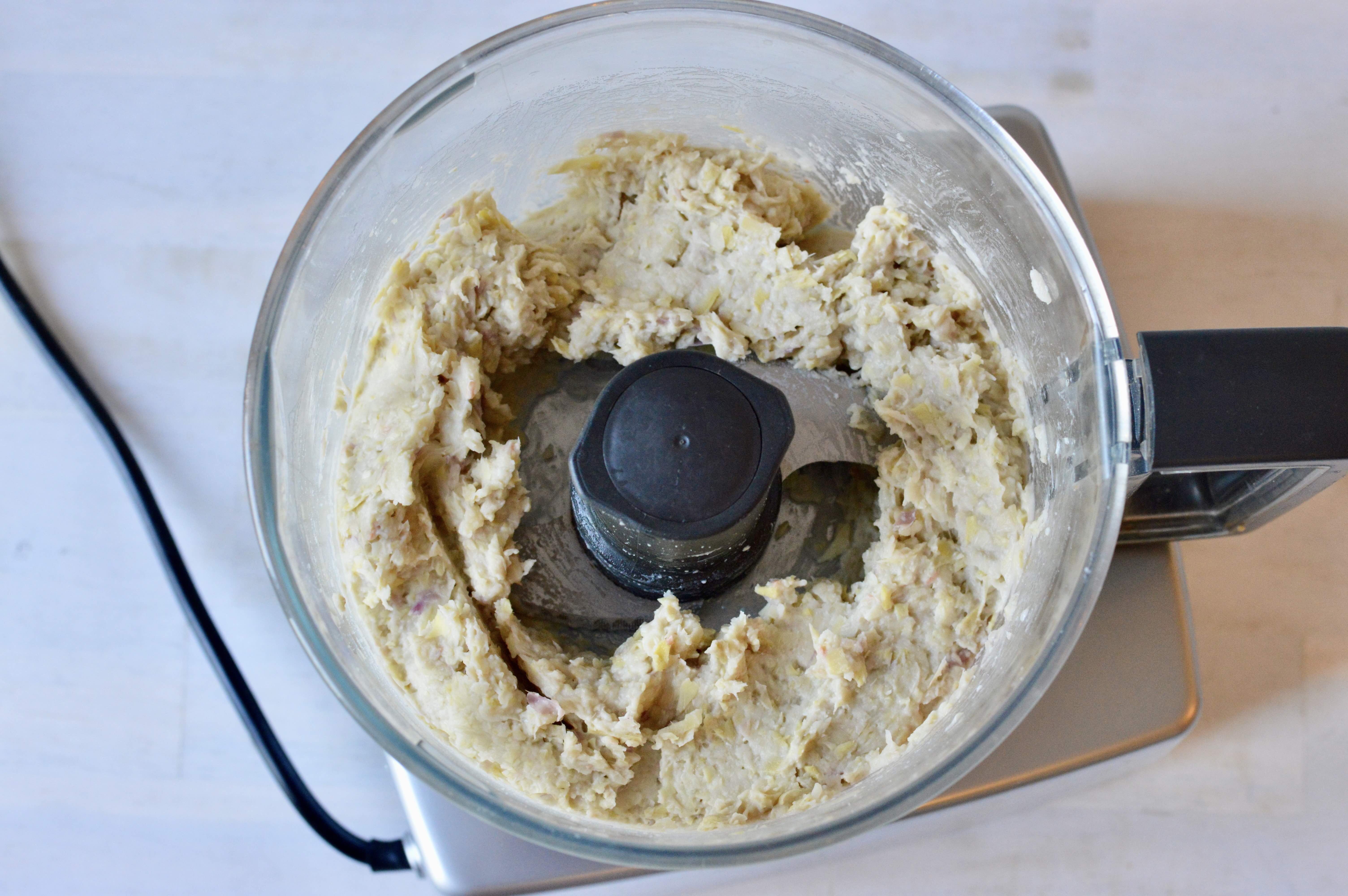 2. Meanwhile, transfer the drained and rinsed beans and artichokes into your food processor bowl and process until semi-creamy, stopping and scraping down sides a few times. This takes less than a minute.