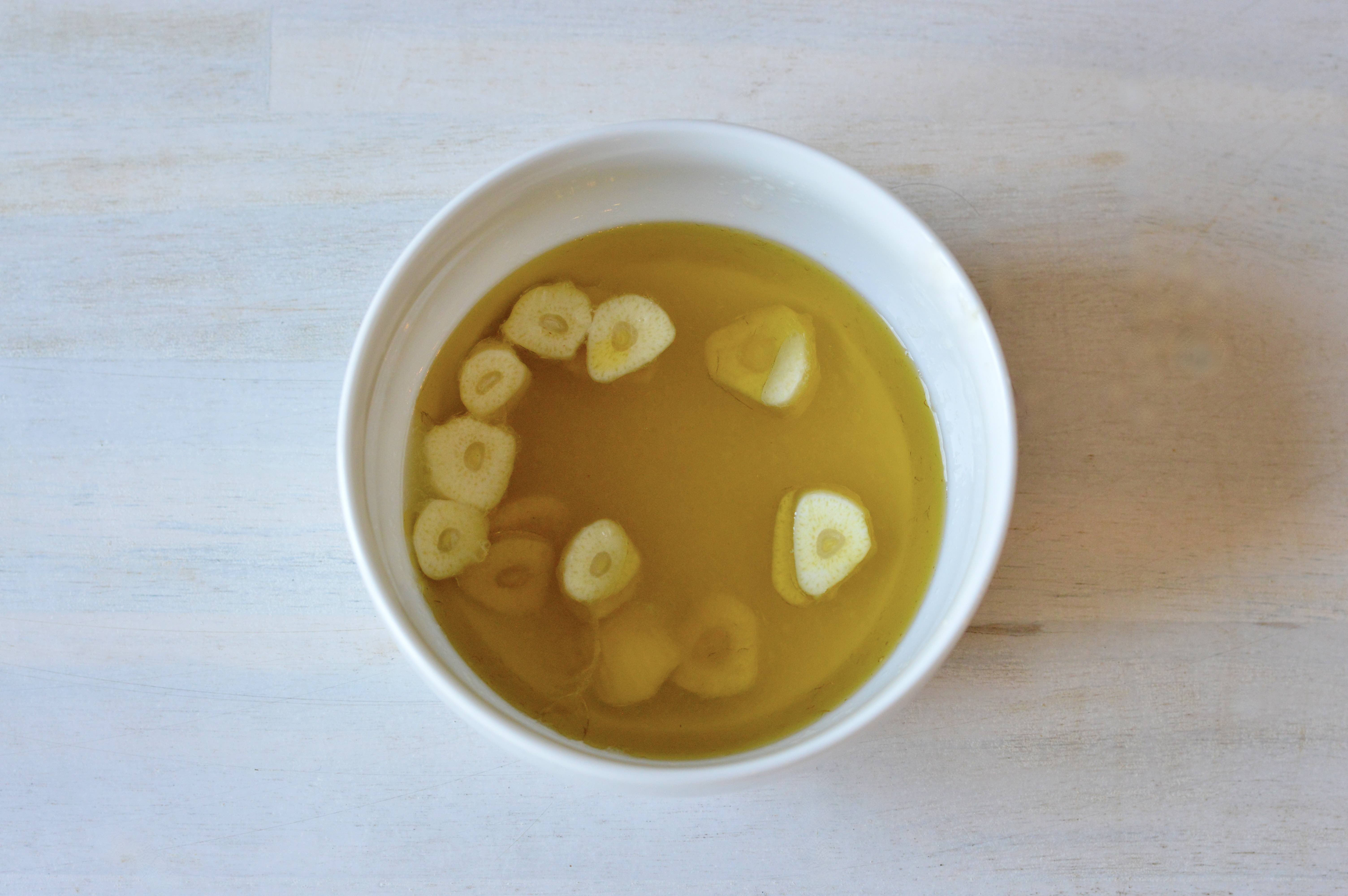 - Slice the garlic clove (s) into small pieces and transfer into a small bowl. Pour the lemon juice and olive oil on the garlic slices and set aside on countertop for 5 minutes or more to soften and lightly marinate.