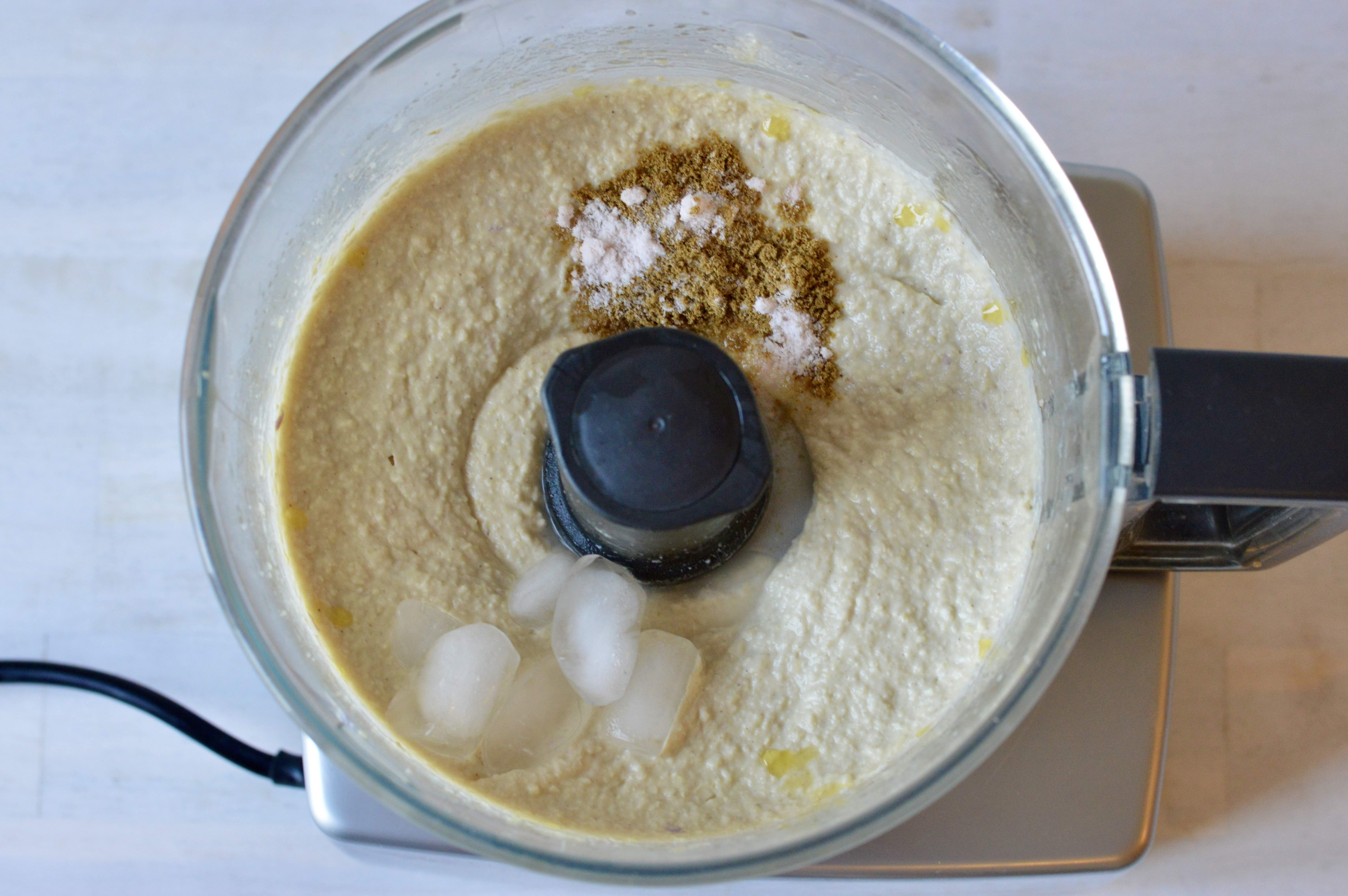 5. Add the salt, pepper, cumin, lemon zest and some small ice cubes. Process for 2 to 3 minutes until smooth. Remember to stop and scrape sides when needed. If you find it too thick, add a teaspoon or two of ice water (some tahinis can be thicker than others, so results can vary).