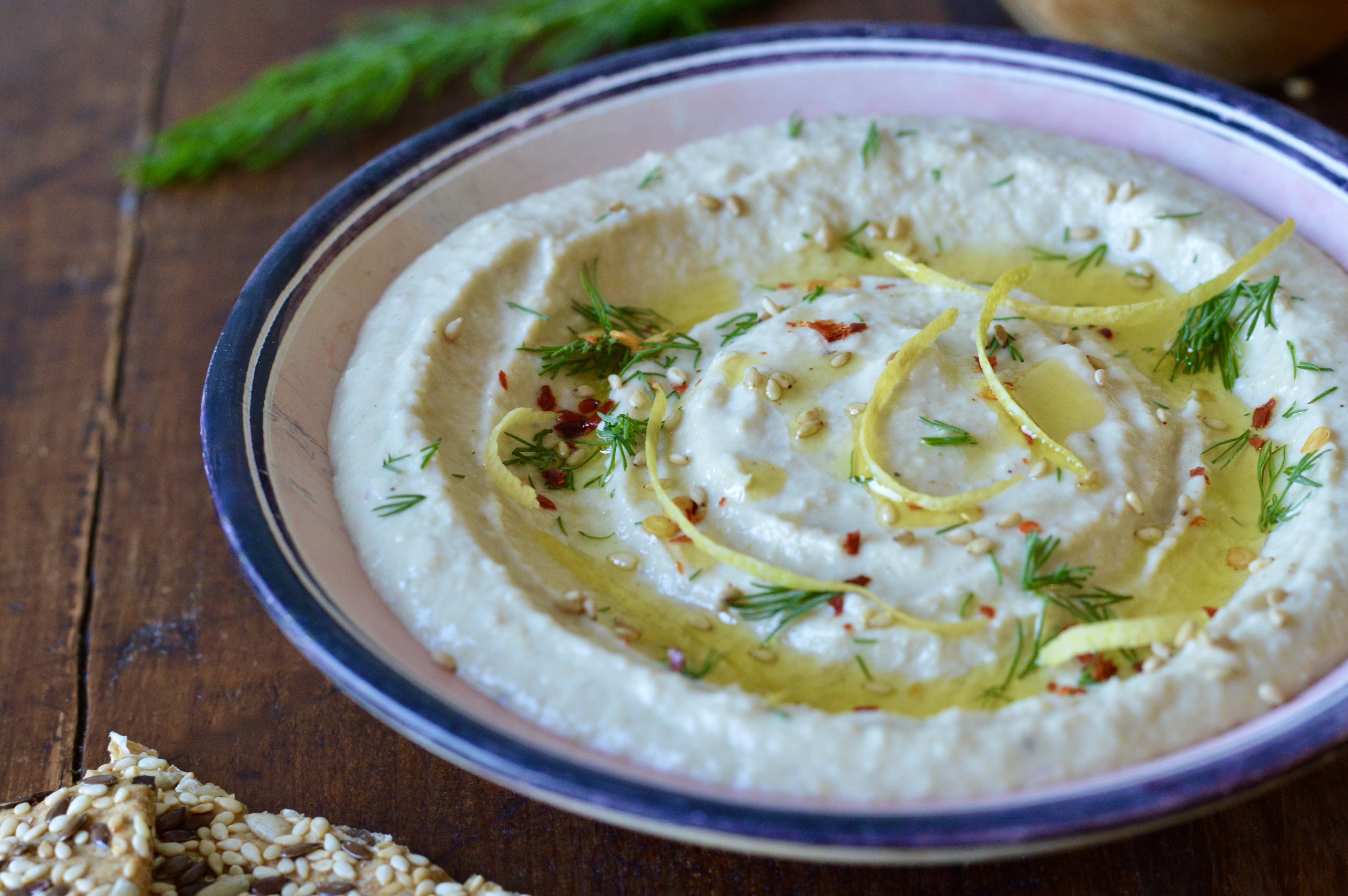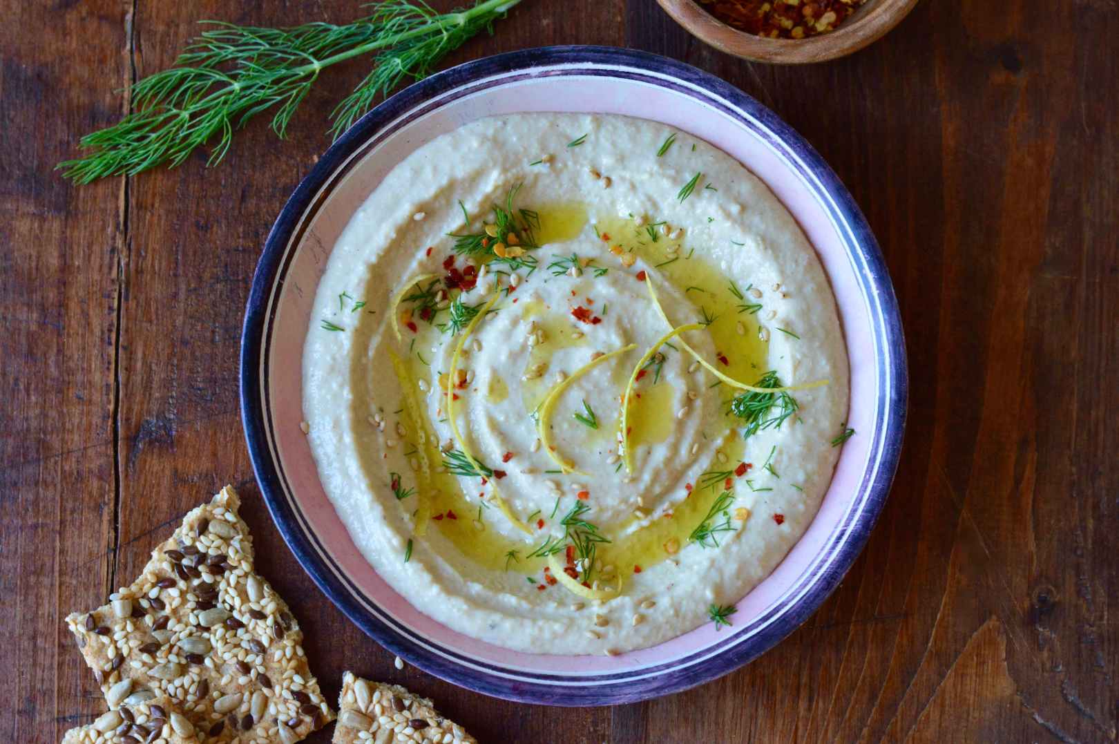 7. For serving, spoon some of the dip into a serving dish. If you want, make a shallow circular well with the back of a small spoon and drizzle some olive oil in it. Garnish as desired. Here I added roasted sesame seeds, red pepper flakes, some lemon peel slivers and dill.
