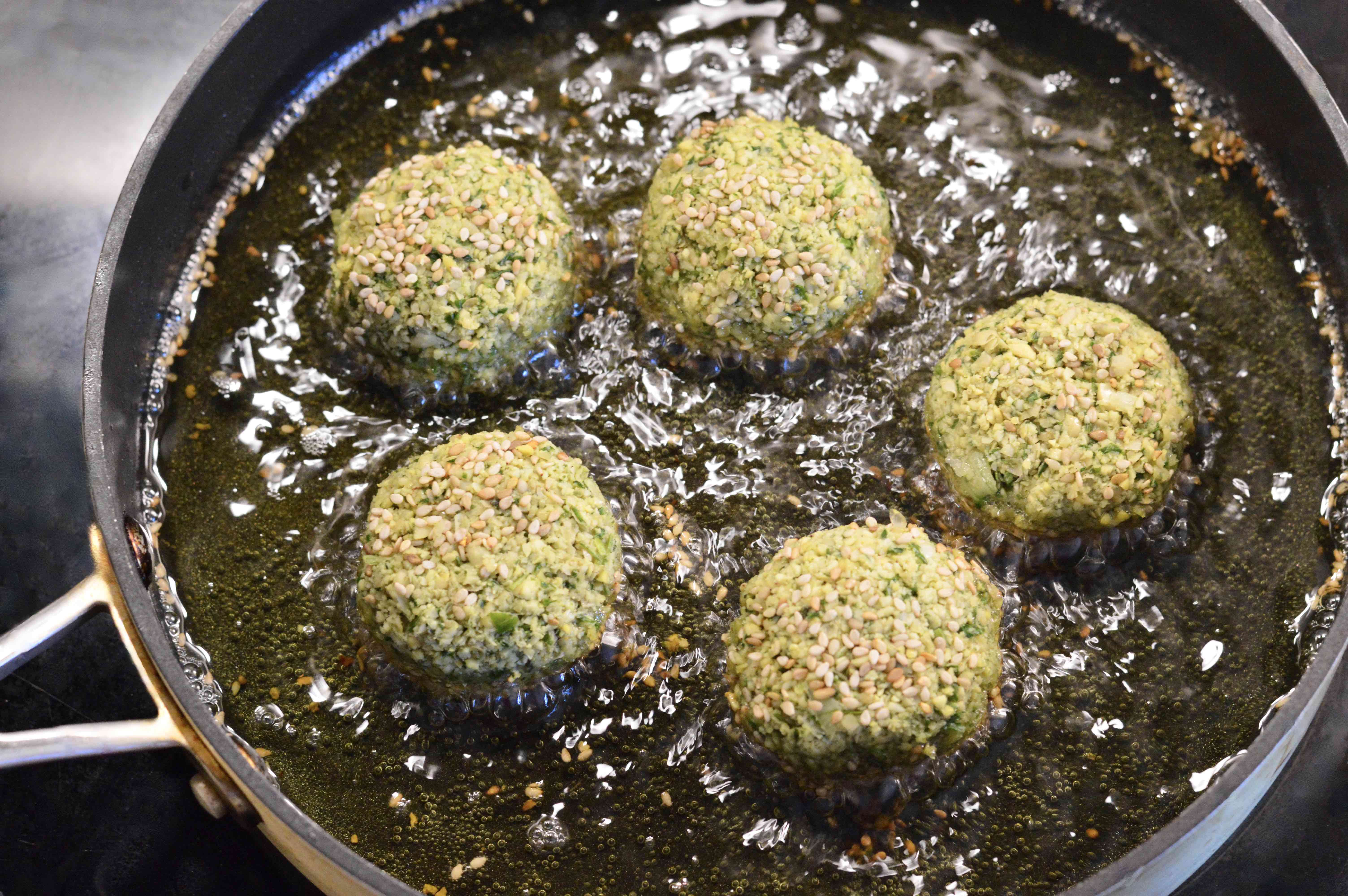 8. On medium-high, heat the oil for 5 to 7 minutes. When hot and shimmering, add the falafel balls and fry them in batches of 5, more or less, depending on the size of your skillet and how many people you are serving. Lower to medium heat and fry for 3 to 4 minutes. When golden, flip over with spoon and repeat on the other side. Remove the balls with a slotted spoon and let them dry on a paper towel. Repeat with remaining falafels.