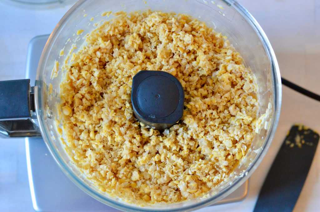 2. With a sieve, drain and rinse the chickpeas. Then, transfer them into your food processor bowl and pulse on and off for about 30 seconds to break up the chickpeas, stopping and scraping down sides if needed. The mixture should be a lumpy paste. Set this aside.