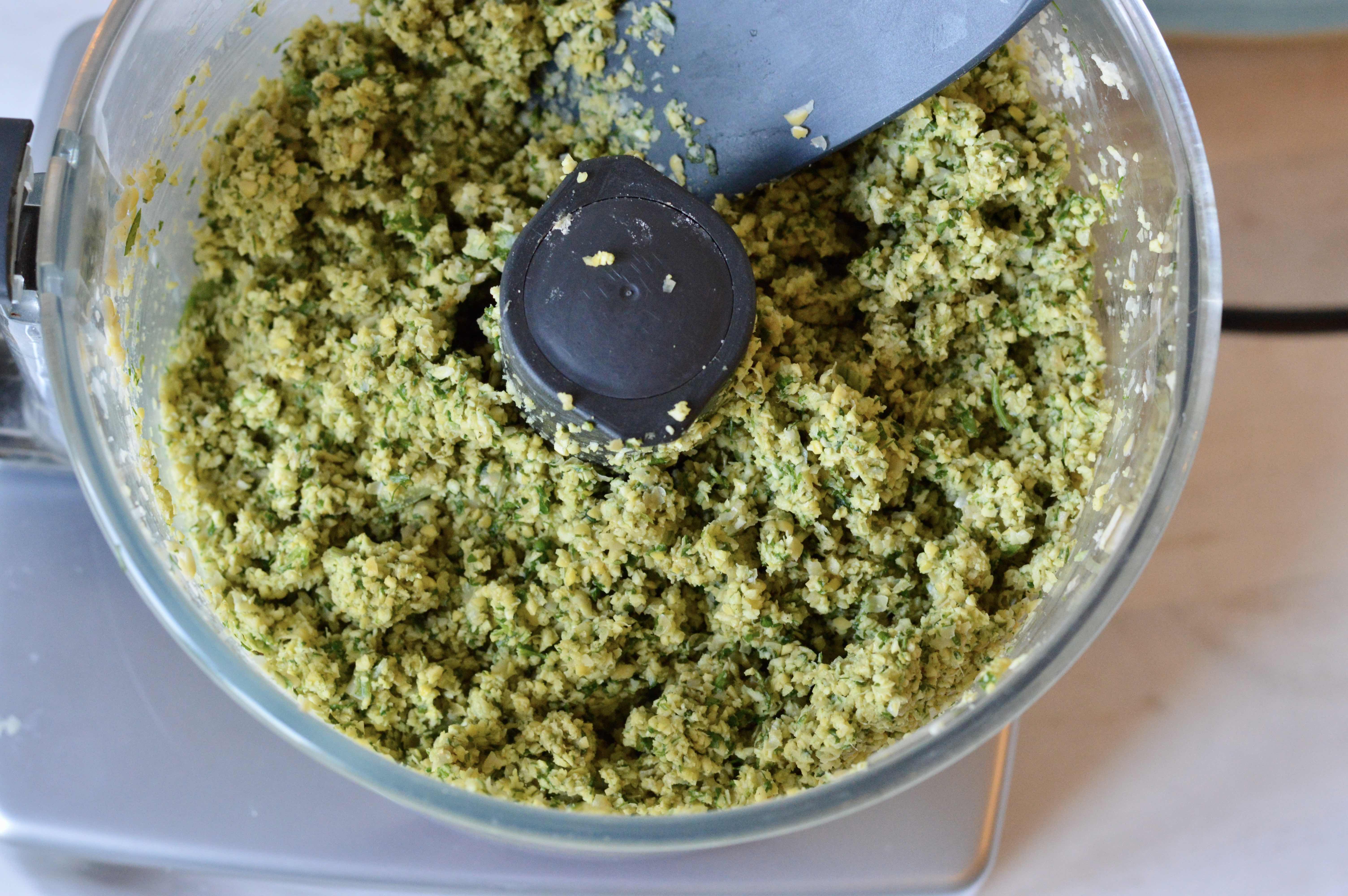 3. Add the green onion, mint, dill, coriander, parsley, spinach and garlic. Process for a minute or so, to mix the greens with the chickpeas, stopping to scrape sides.