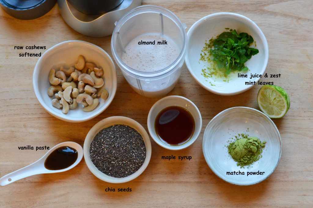 For freshness and taste, I added some lime zest and juice, a small bunch of mint leaves and some vanilla paste. The pudding is also sweetened with maple syrup.