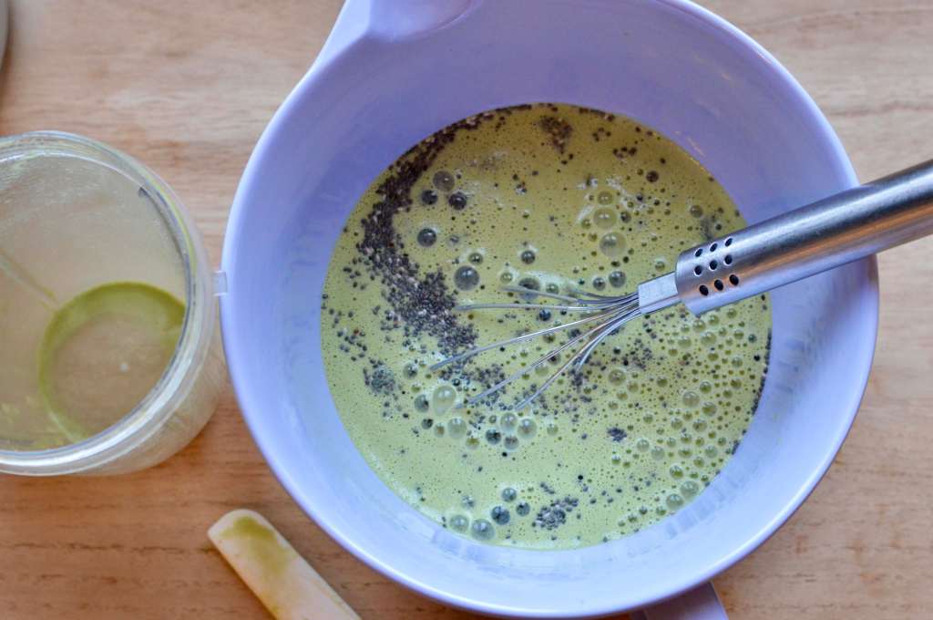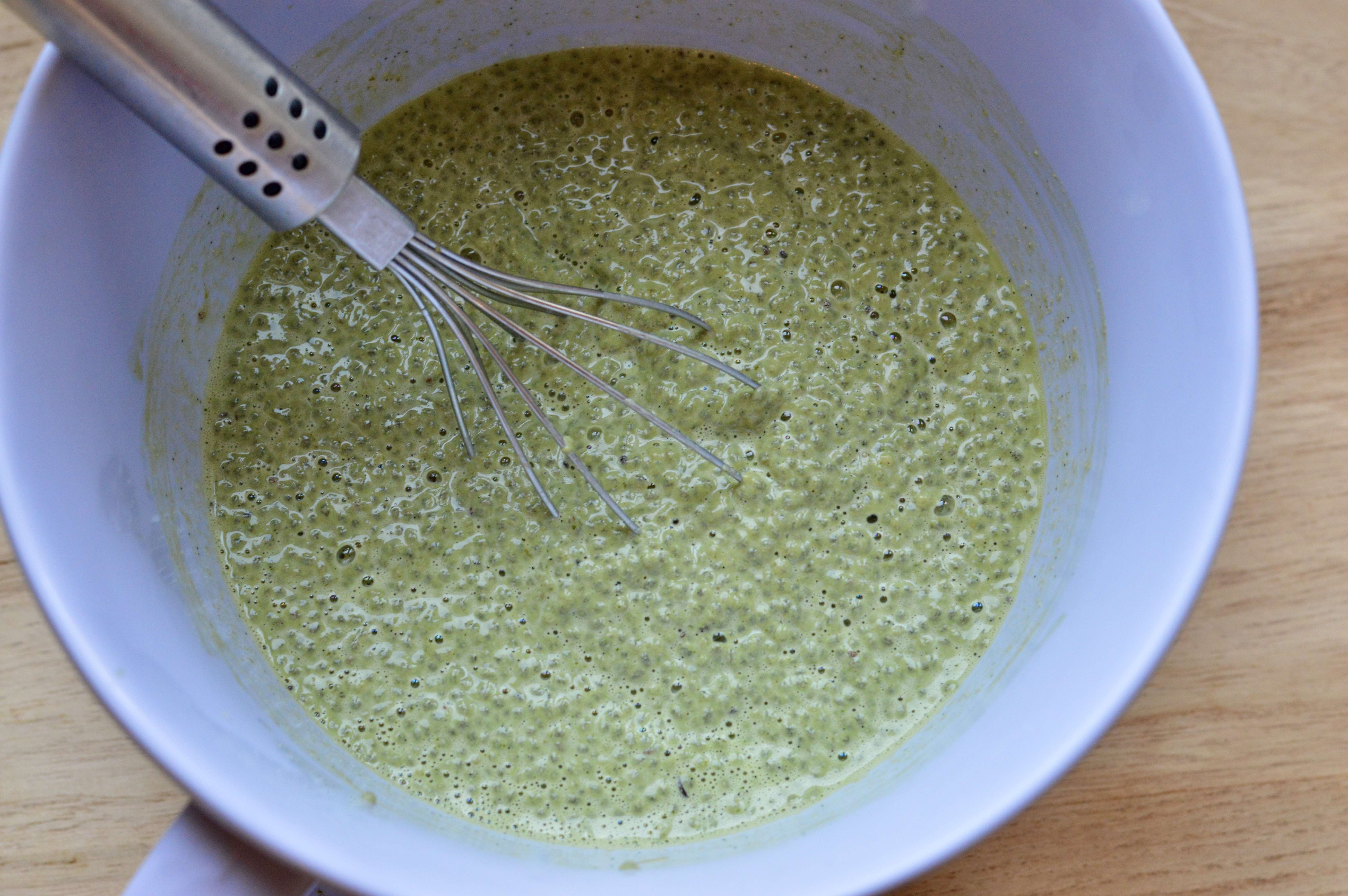 2. In a medium-size bowl, add the chia seeds. Pour the green liquid over the seeds and hand whisk to blend. Place in the refrigerator for 15 minutes to thicken (10 minutes if your almond milk was already chilled).