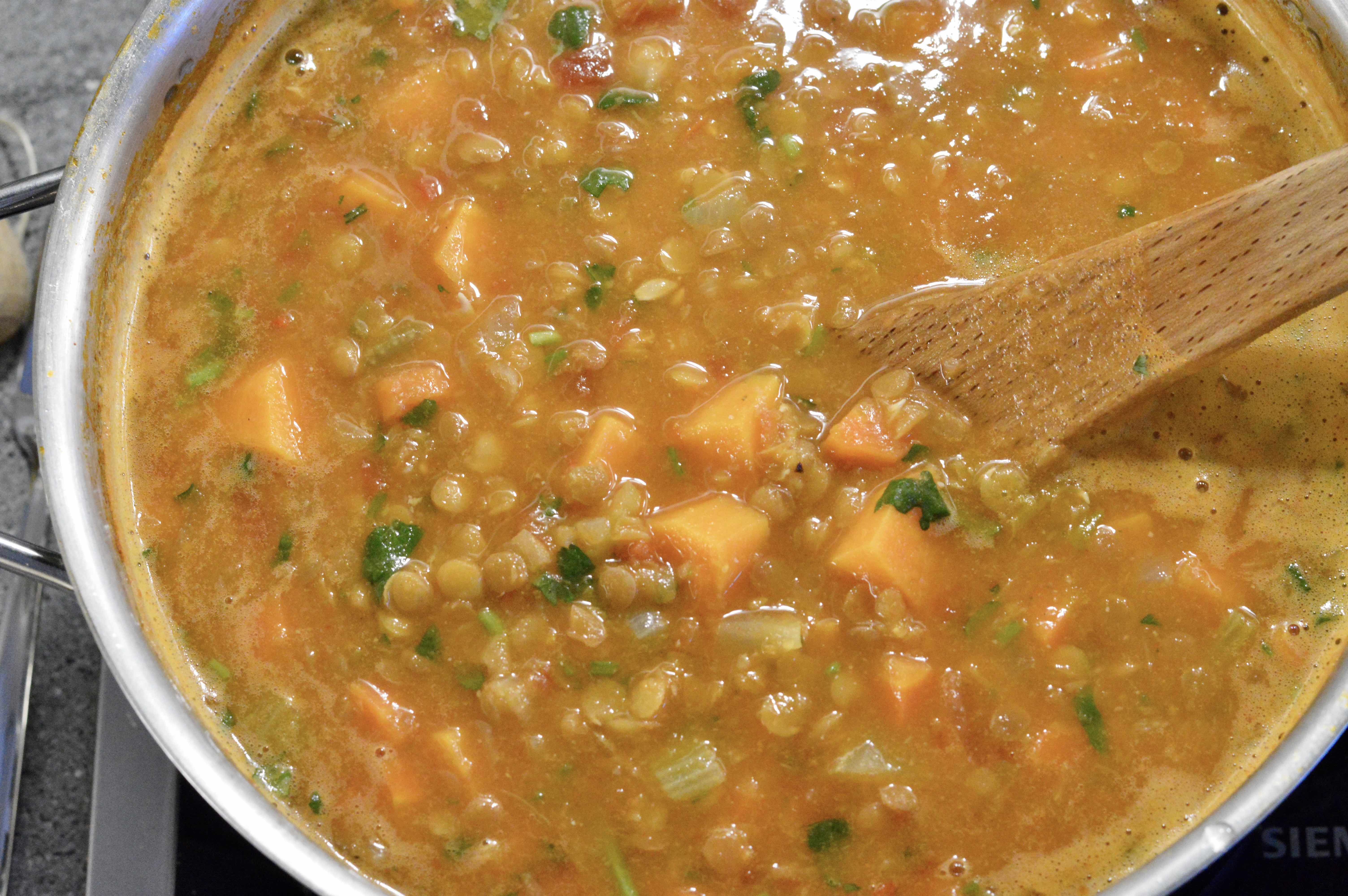 5. Bring to a rapid boil and immediately reduce heat to medium and maintain a gentle boil. Cover and cook for 20-30 minutes, or until the potatoes and lentils are soft. Stir from time to time.