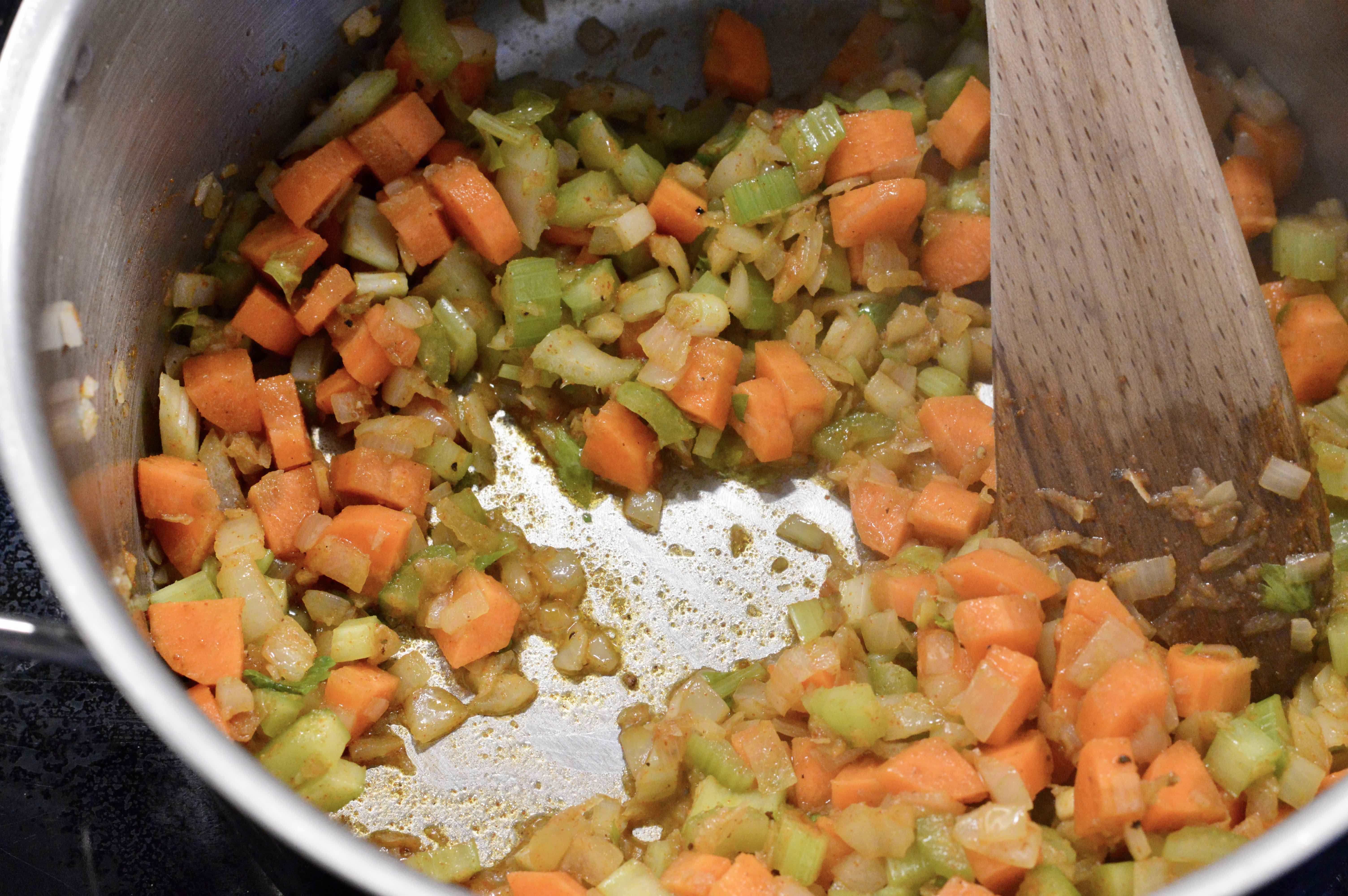 3. Add carrots and celery, spices, salt and pepper and cook for 3 minutes mixing often.