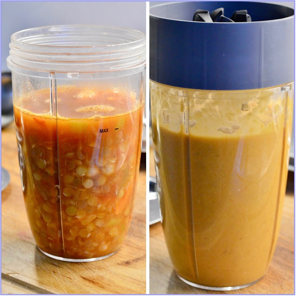 6. With a ladle or cup, transfer about 21/2 cups of the soup into a small blender or NutriBullet bowl, leaving bay leaves behind (make sure to gather an equal distribution of broth & ingredients.) Blend until creamy.
