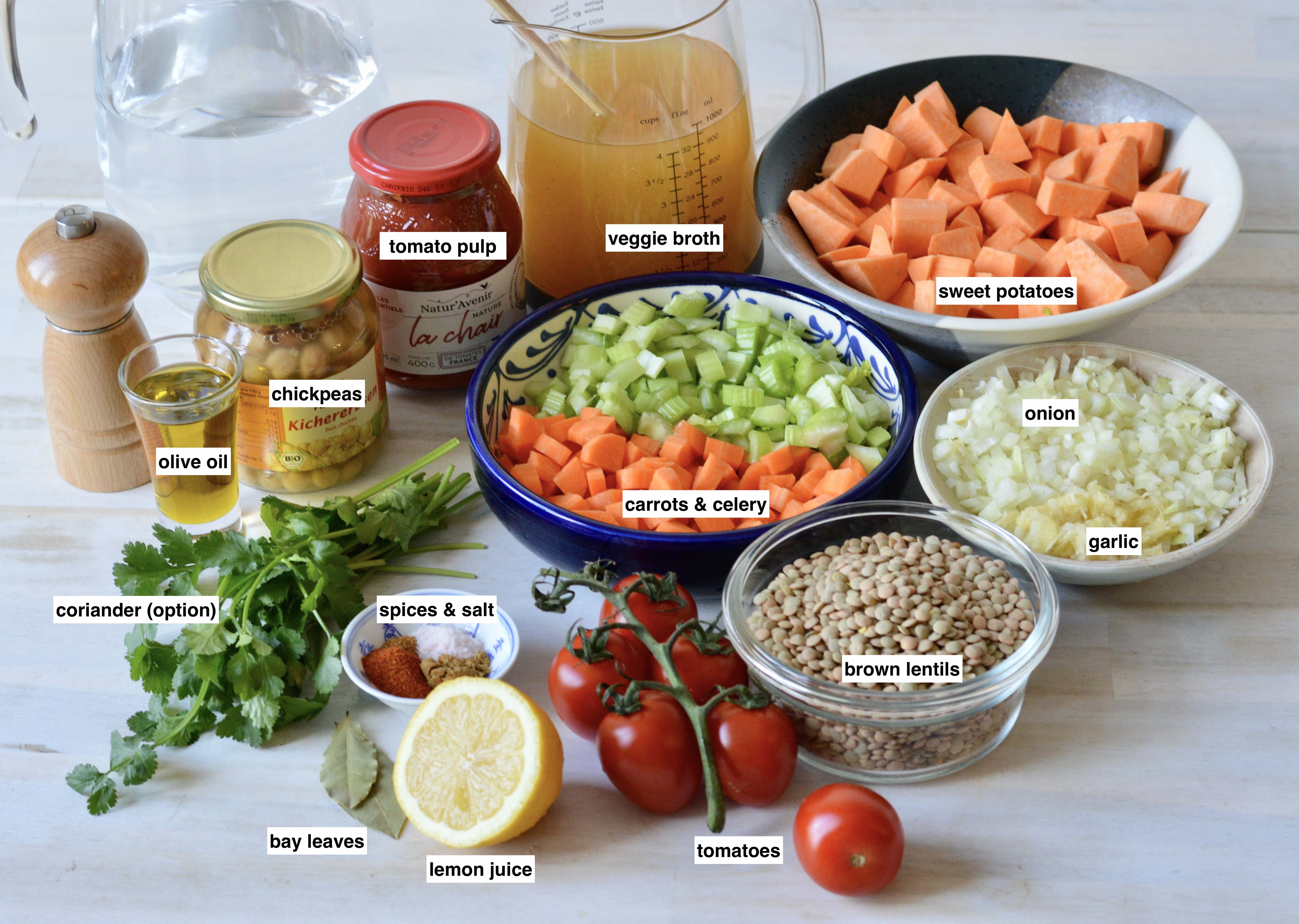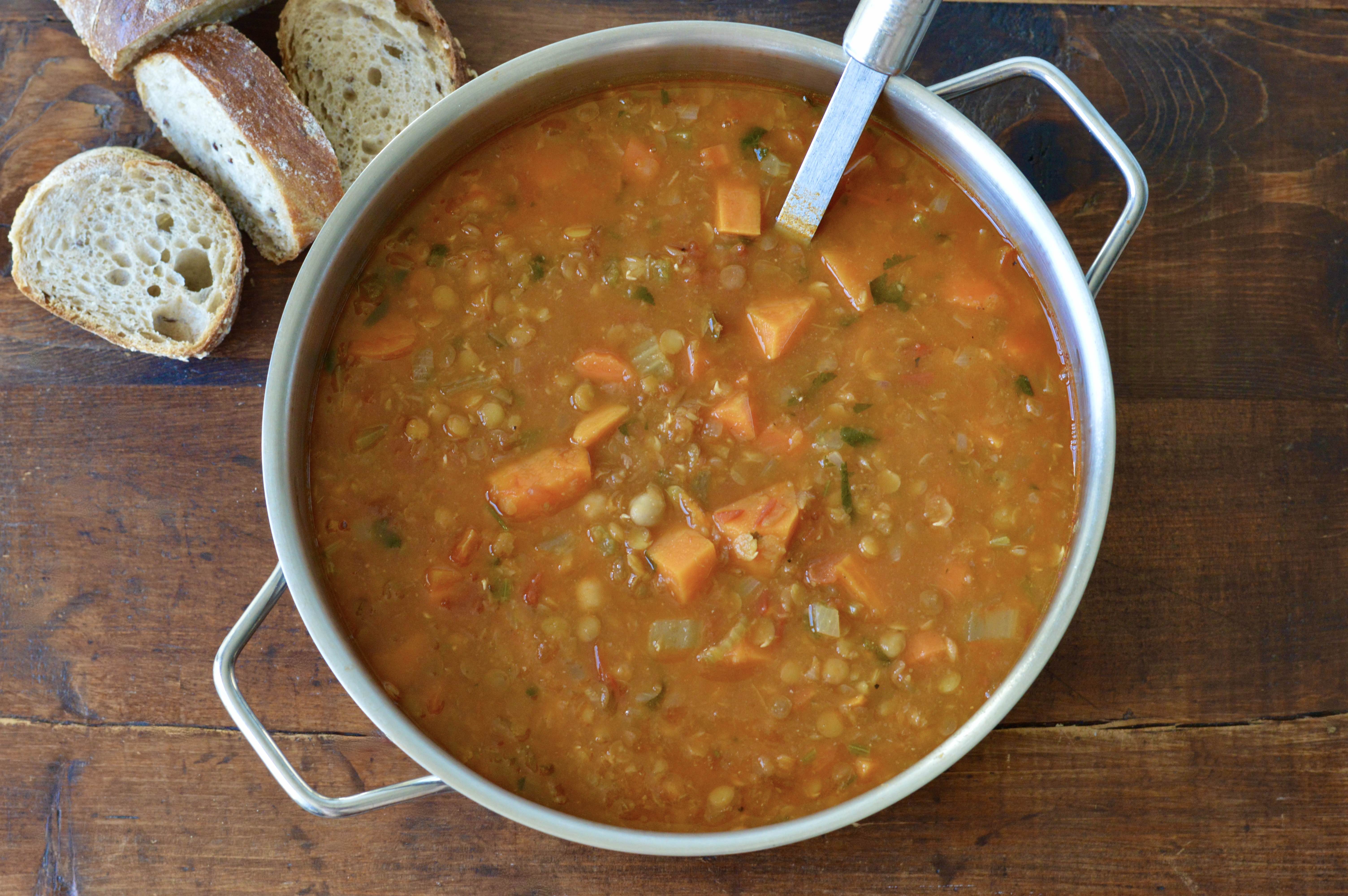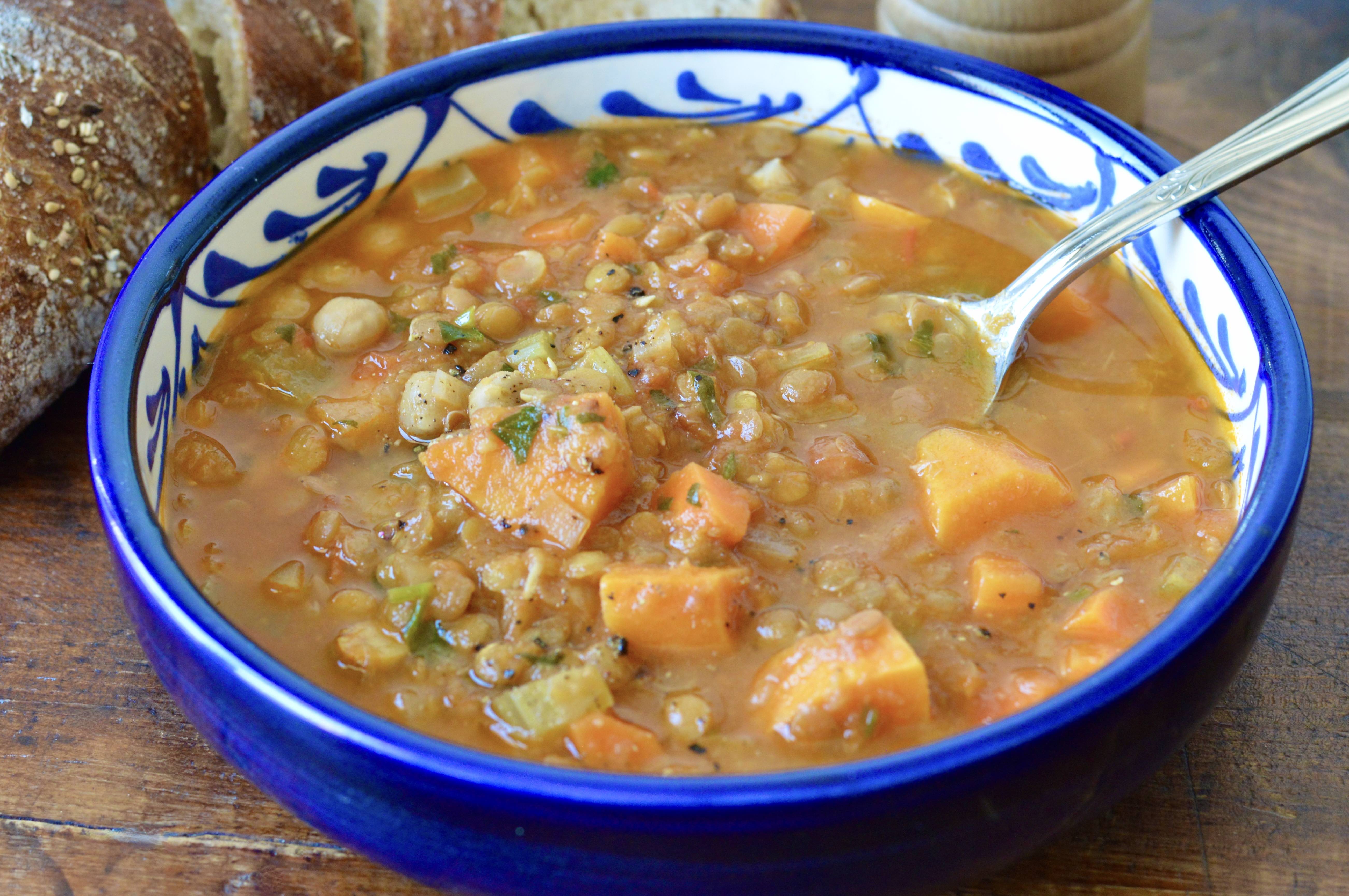 One bowl of this lentil sweet potato soup is a complete healthy meal. Packed with protein, fibre, iron, minerals, vitamins and carbohydrates, it has everything that your body needs. For that extra protein boost, I topped the lentils with a jar of chickpeas.