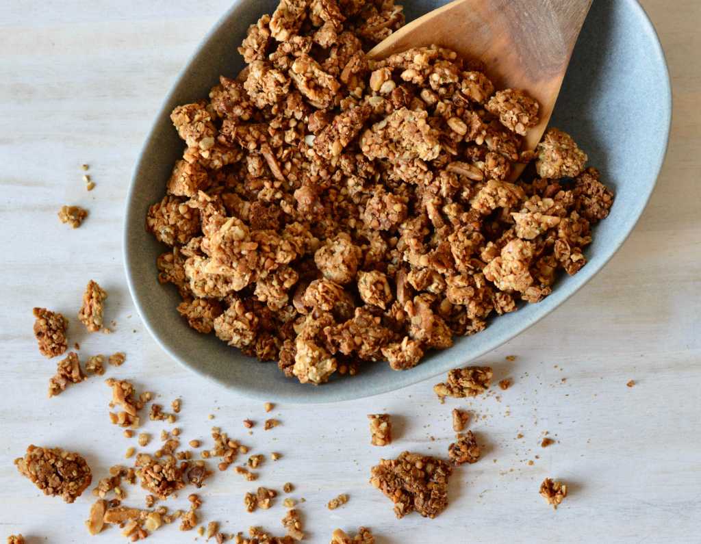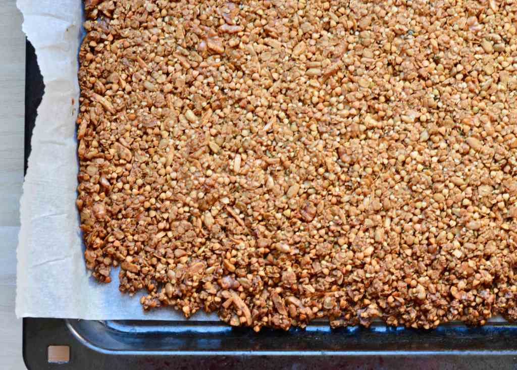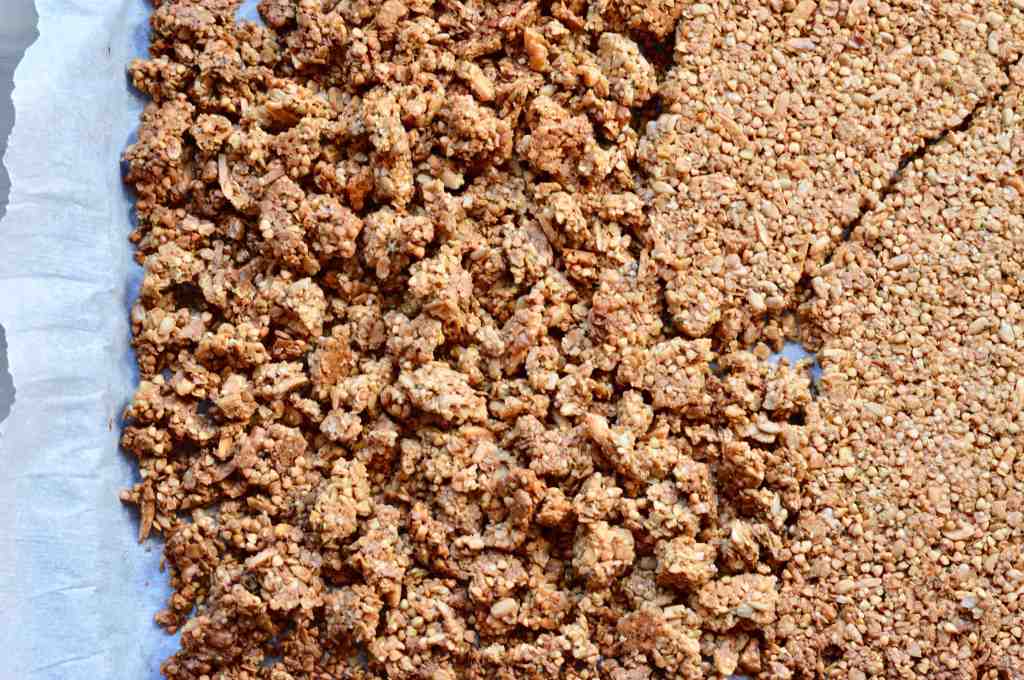 Made with seeds, nuts (or coconut flakes), olive oil, maple syrup and nut butter, it’s wholesome and super crunchy. In this recipe, the crisp, crunchy clusters mingle with the creamy richness of nut butter and natural sweetness of maple syrup.