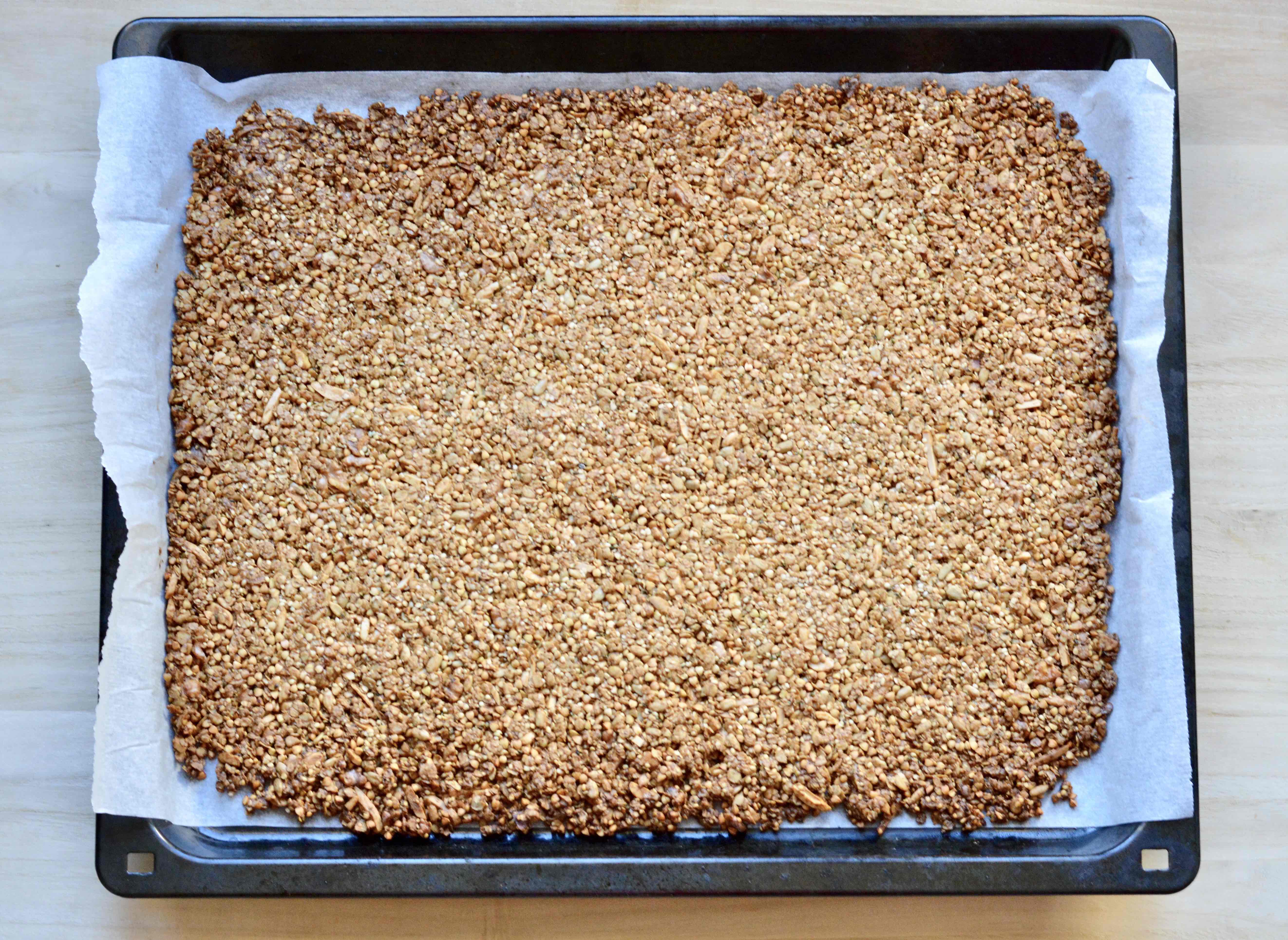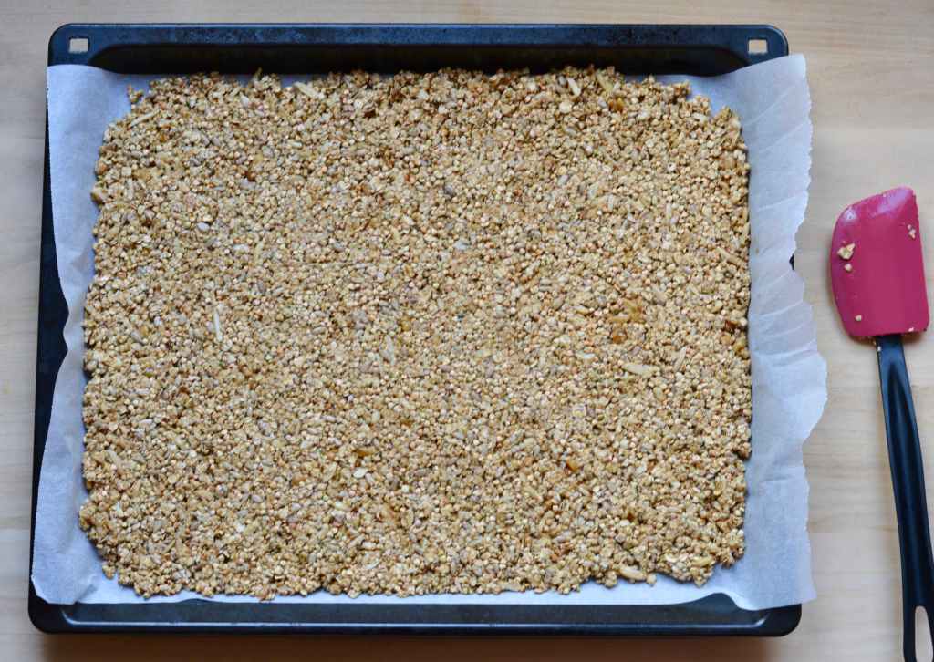 4. Transfer the granola onto a large baking sheet lined with parchment. Spread it and pat it down firmly and evenly until it is about 1/2 to 1 cm thick.