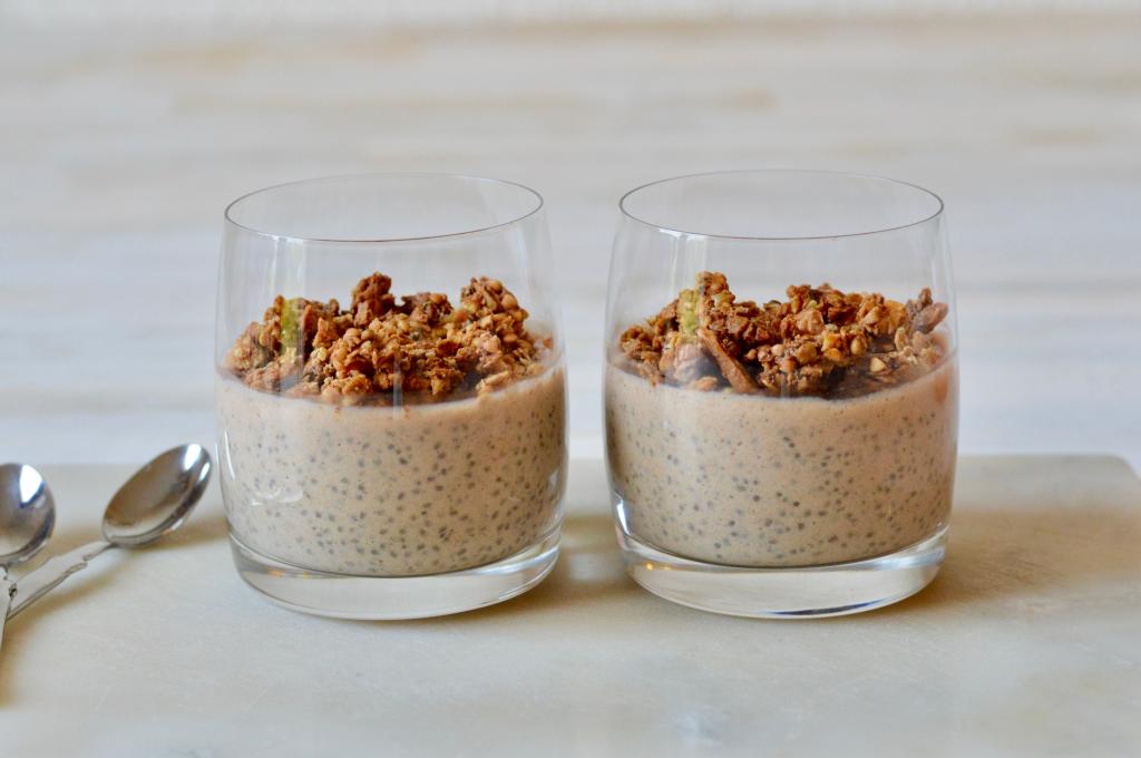 The pudding is made with a combination of wholesome, natural ingredients. The base consists of unsweetened plant milk and yoghurt (Greek or plain), which provide a creamy texture and tangy flavour. For a taste of fruity sweetness, without refined sugars, I add Medjool dates and sliced banana. Two tablespoons of nut butter give it a rich, nutty essence. And for a warm spicy finish, I add ground cinnamon and cardamom. If you want, you can also add a dash of vanilla.