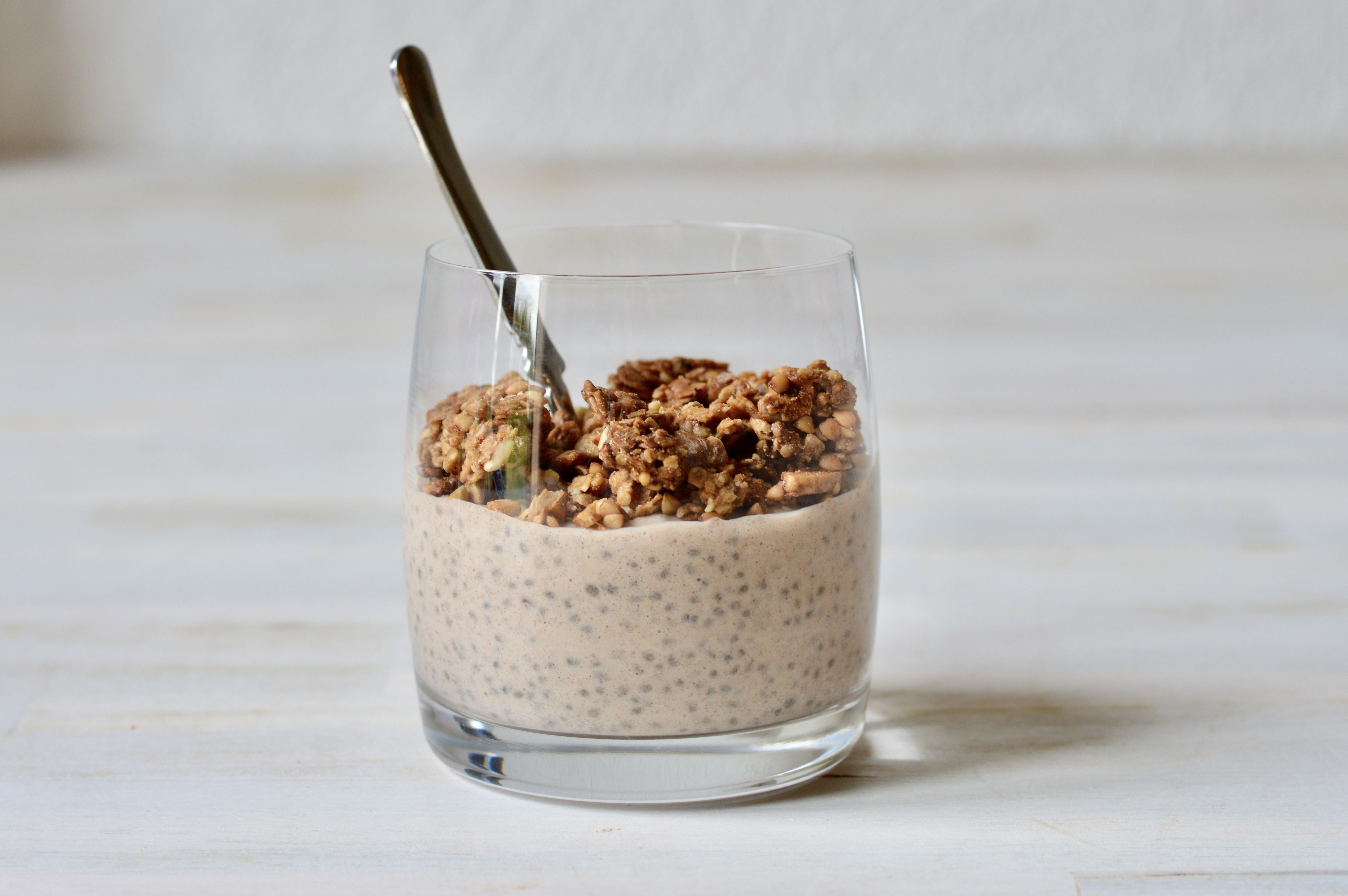 The pudding is made with a combination of wholesome, natural ingredients. The base consists of unsweetened plant milk and yoghurt (Greek or plain), which provide a creamy texture and tangy flavour. For a taste of fruity sweetness, without refined sugars, I add Medjool dates and sliced banana. Two tablespoons of nut butter give it a rich, nutty essence. And for a warm spicy finish, I add ground cinnamon and cardamom. If you want, you can also add a dash of vanilla.