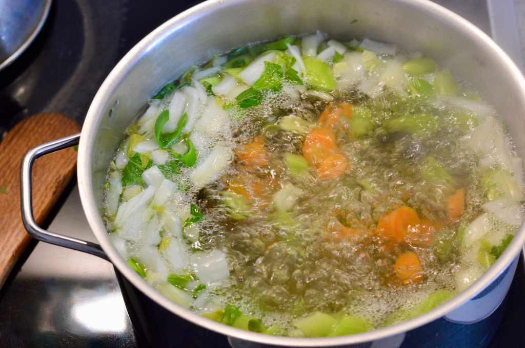 - Peel carrots, onion or other vegetables. Chop all veggies into pieces or chunks and transfer them into a big soup pot. Add about 3 litres of water.