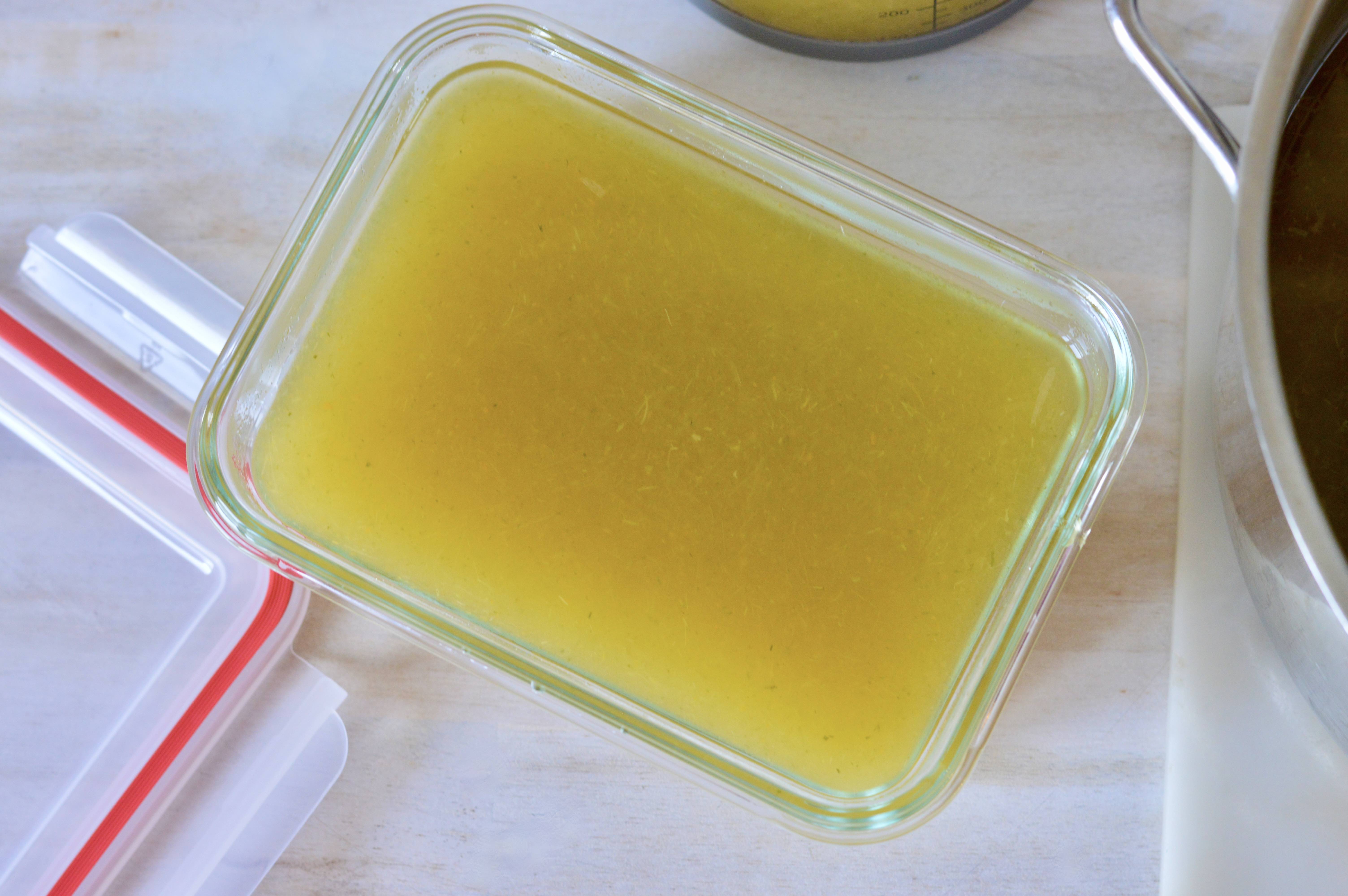 5. When the stock has cooled, transfer into separate containers with lids—I usually add about 3 to 4 cups of stock per container.