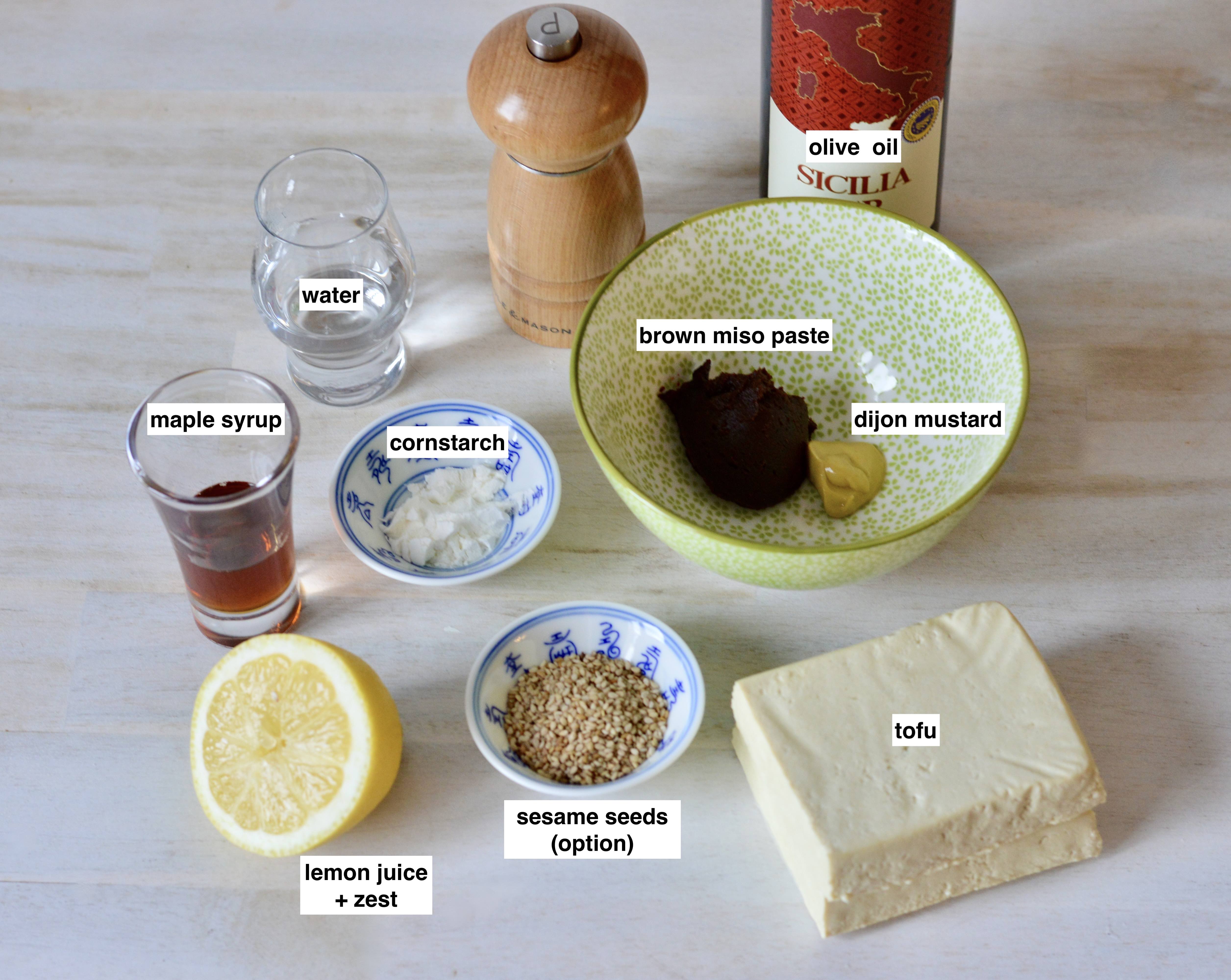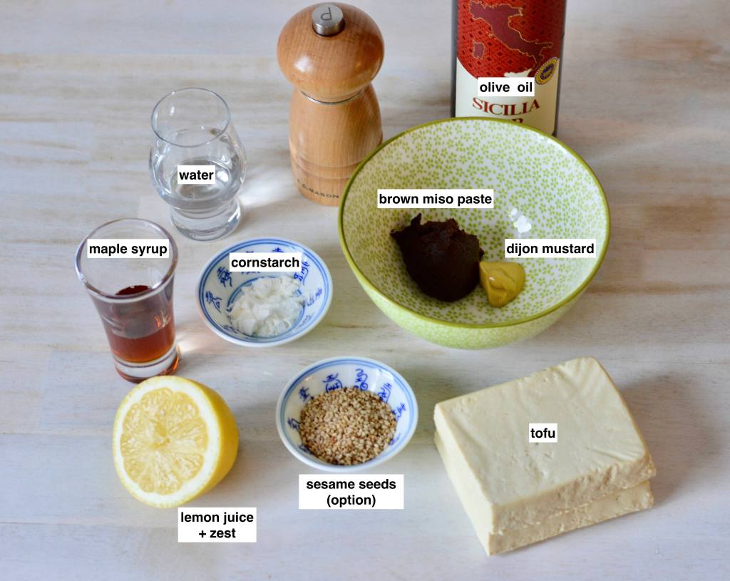 1. In a small bowl prepare the marinade. Hand mix with fork or whisk until blended: the miso paste, Dijon mustard, lemon juice, lemon zest, maple syrup, oil, water and pepper. Then add the cornstarch or arrowroot and mix again until dissolved. Can add extra spices or herbs, if using.
