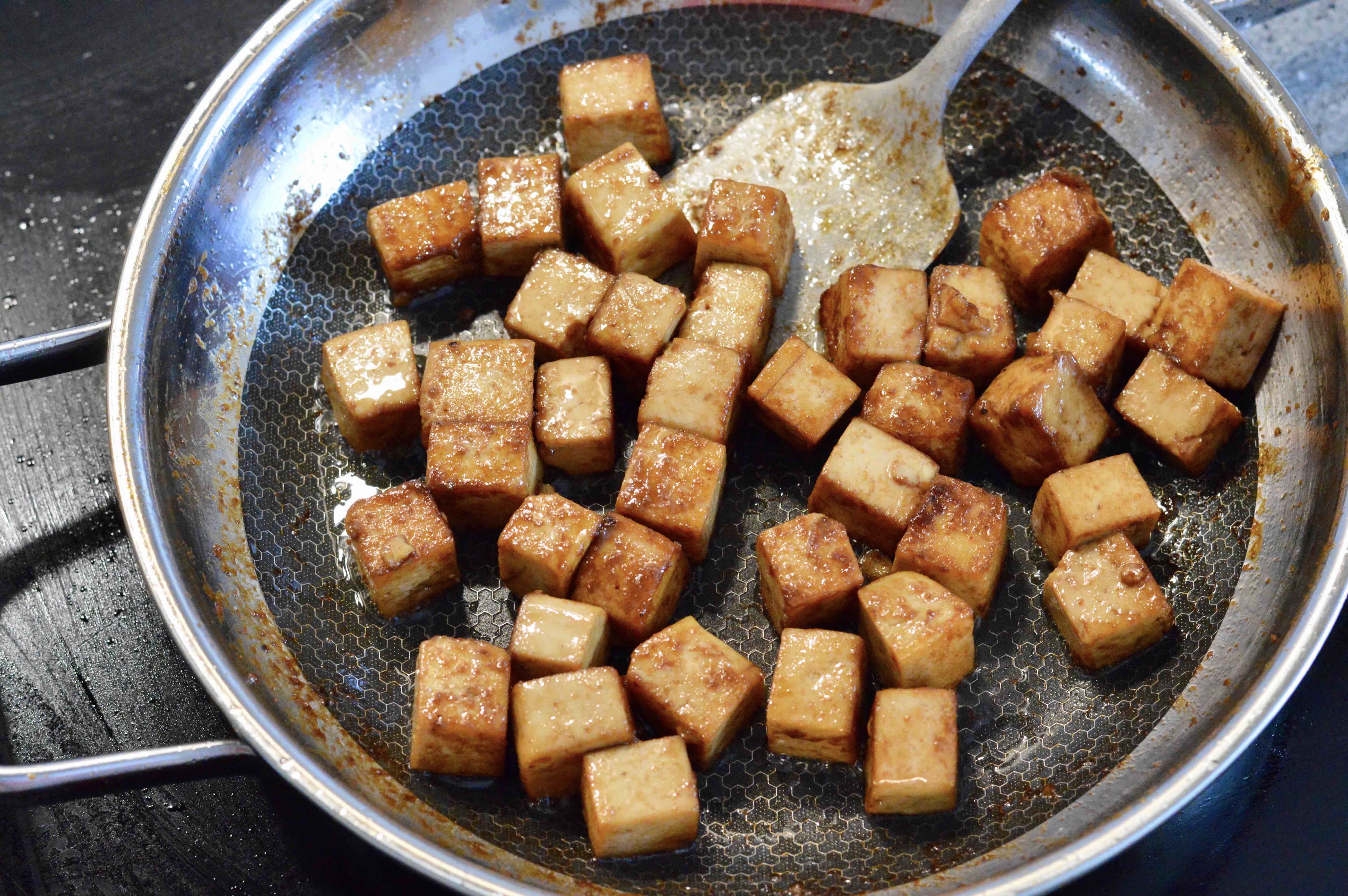 4. When ready to fry the tofu cubes on stove top, toss them a few more times in the marinade. On medium-high, heat up a pan with 2 tablespoons of oil.