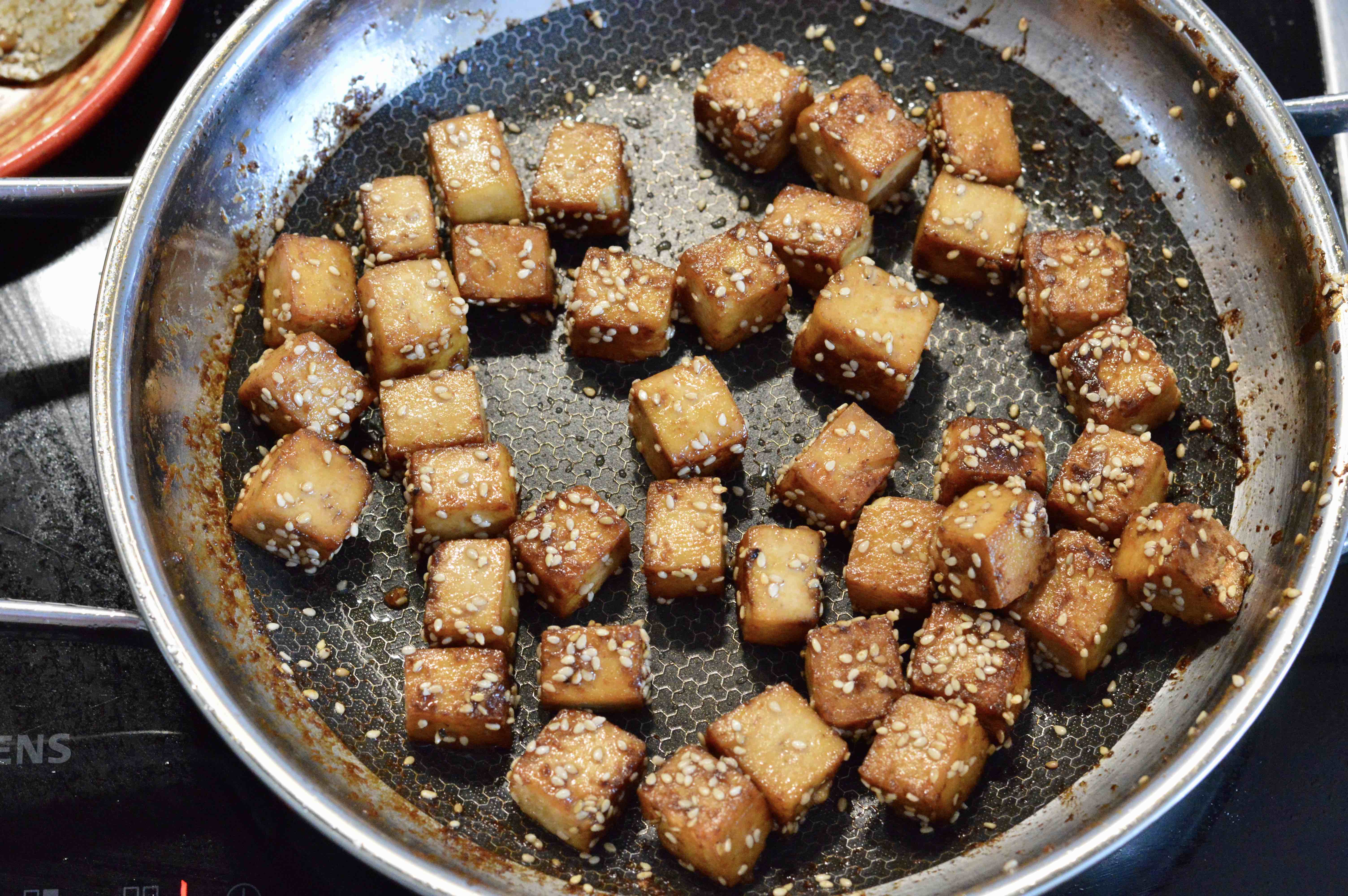 6. Fry the cubes for about 8-10 minutes or until golden brown on the outside, by turning and rolling them regularly in the hot pan. Near the end of frying, sprinkle some sesame seeds on the cubes and toss again in hot pan.
