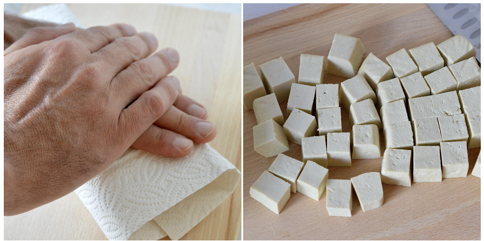 2. Rinse the tofu block under tap water and press it wrapped in paper towel to eliminate excess moisture (manually or with a tofu press). Pat dry and slice into cubes.