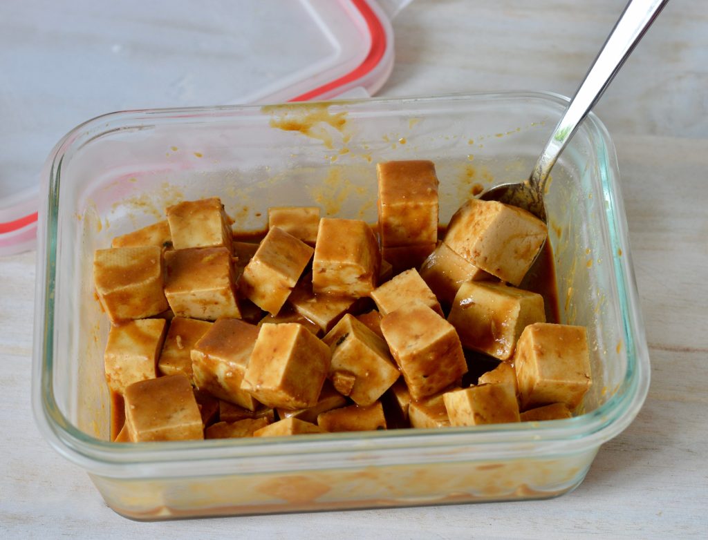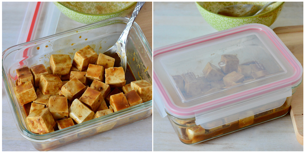 3. Transfer tofu cubes into a shallow dish and pour the marinade over them. Gently toss a few times to evenly coat the cubes. Cover and allow to marinate in refridgerator for 2 hours or longer, tossing halfway.