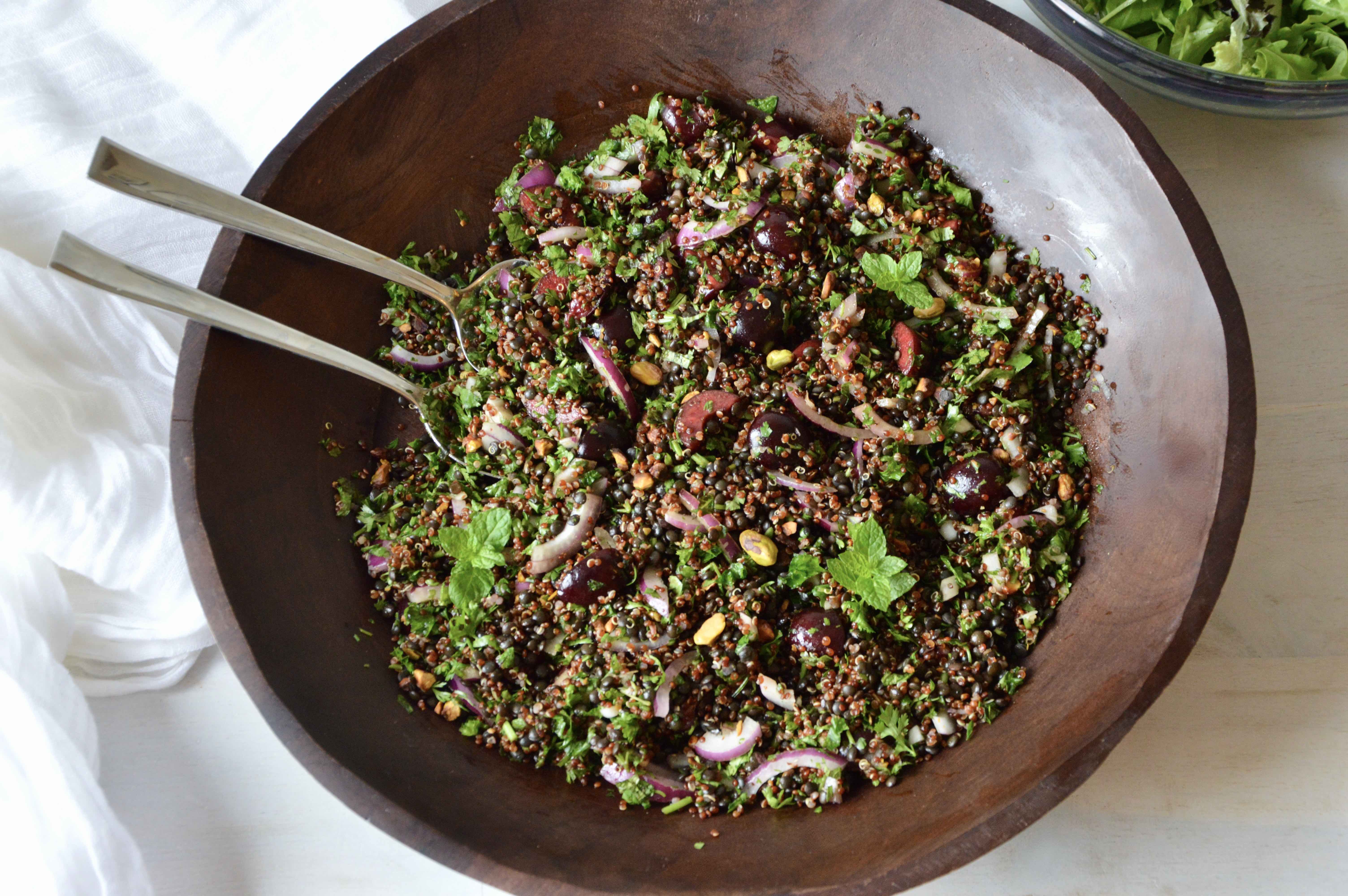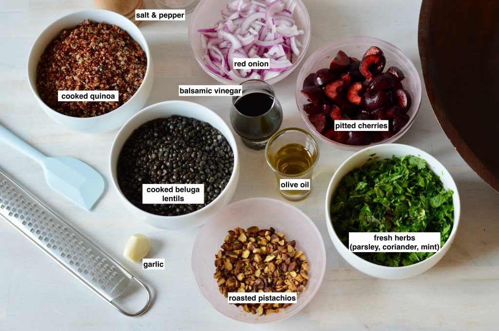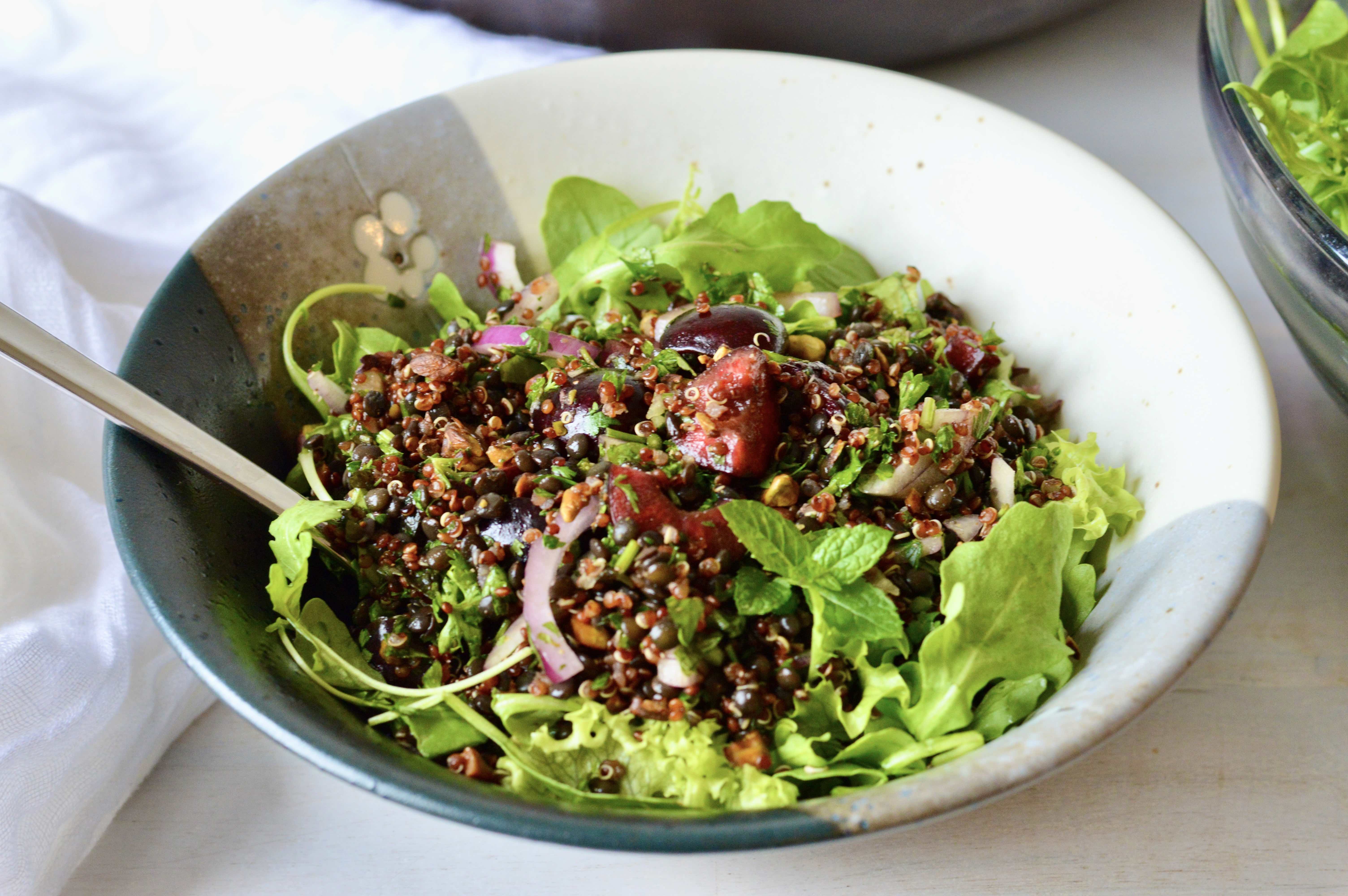 Cherries are in peak season right now and they bring their juicy sweetness and health benefits to this flavourful salad. Packed with antioxidants, vitamins, and minerals, cherries can help reduce inflammation, support heart health, and boost your immune system. Paired with protein-rich black beluga lentils and red quinoa grain, this salad offers a complete, plant-based protein source, providing all the essential amino acids your body needs.
