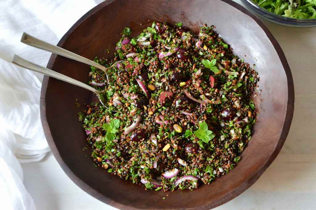 - Measure about 11/2 cups cooked lentils + 11/2 cups cooked quinoa. Prepare all remaining ingredients as above and transfer everything, except the fresh greens, into a big salad bowl. Toss well.