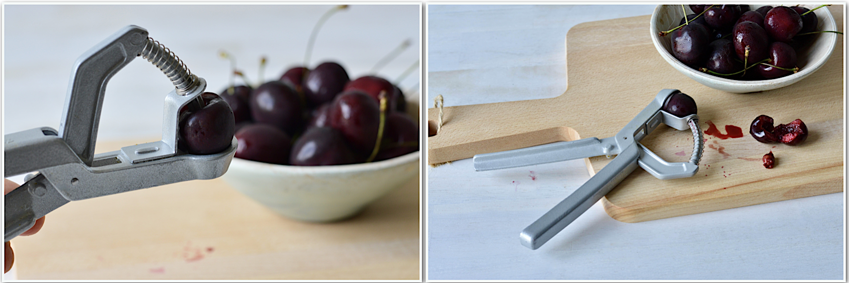 - Pit the cherries by hand with a small knife or with a cherry/olive pitter (see image below).