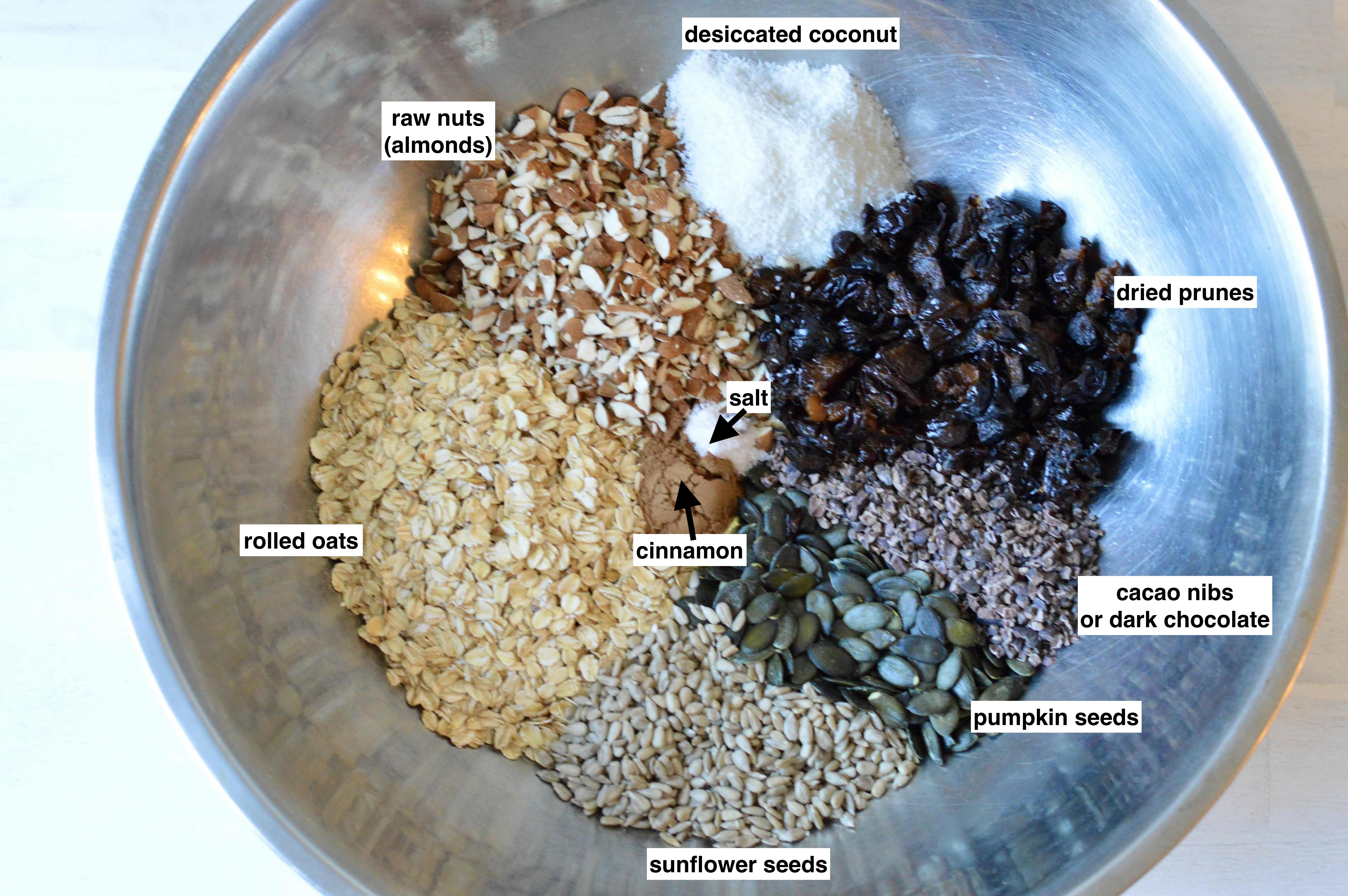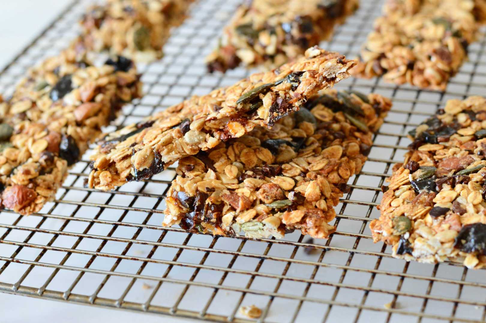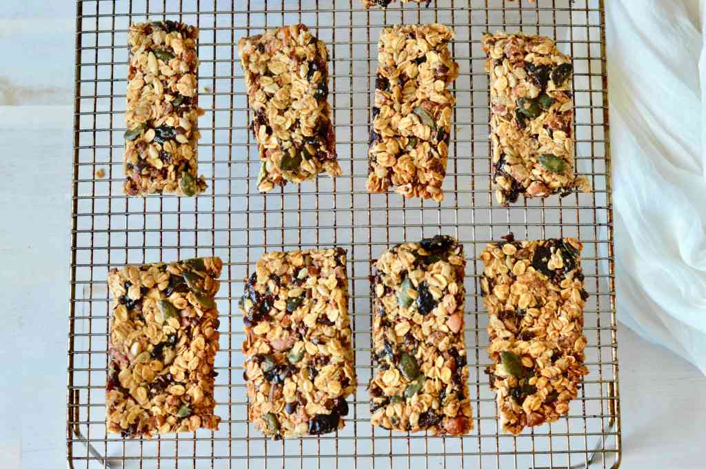 These homemade granola bars are packed with oats, nuts, seeds, cacao nibs, nut butter, and dried prunes, making them a healthier alternative to most store-bought options.