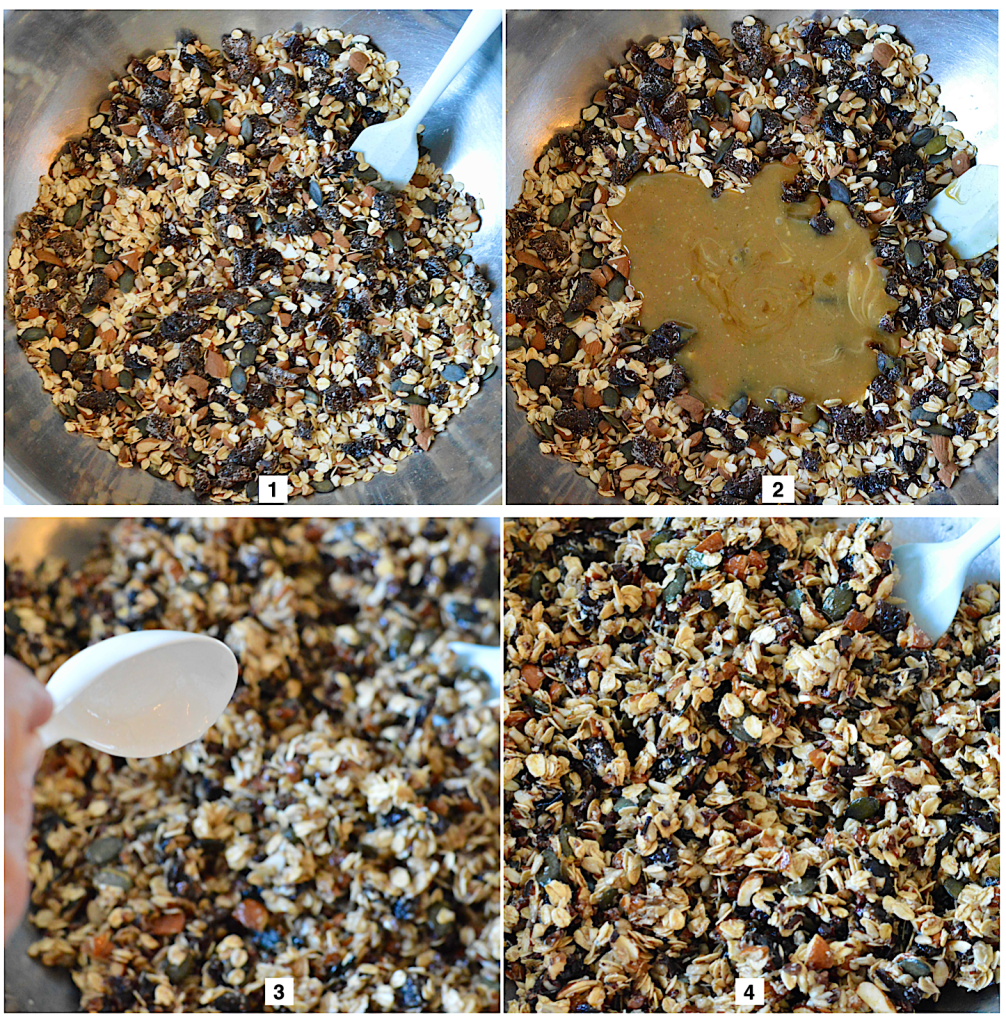 Step 2. In large bow: (1) Add the dry ingredients and mix with spatula. (2) Add the nut butter mixture and mix until combined. (3) Add the melted coconut oil. (4) Mix until oil is incorporated throughout.
