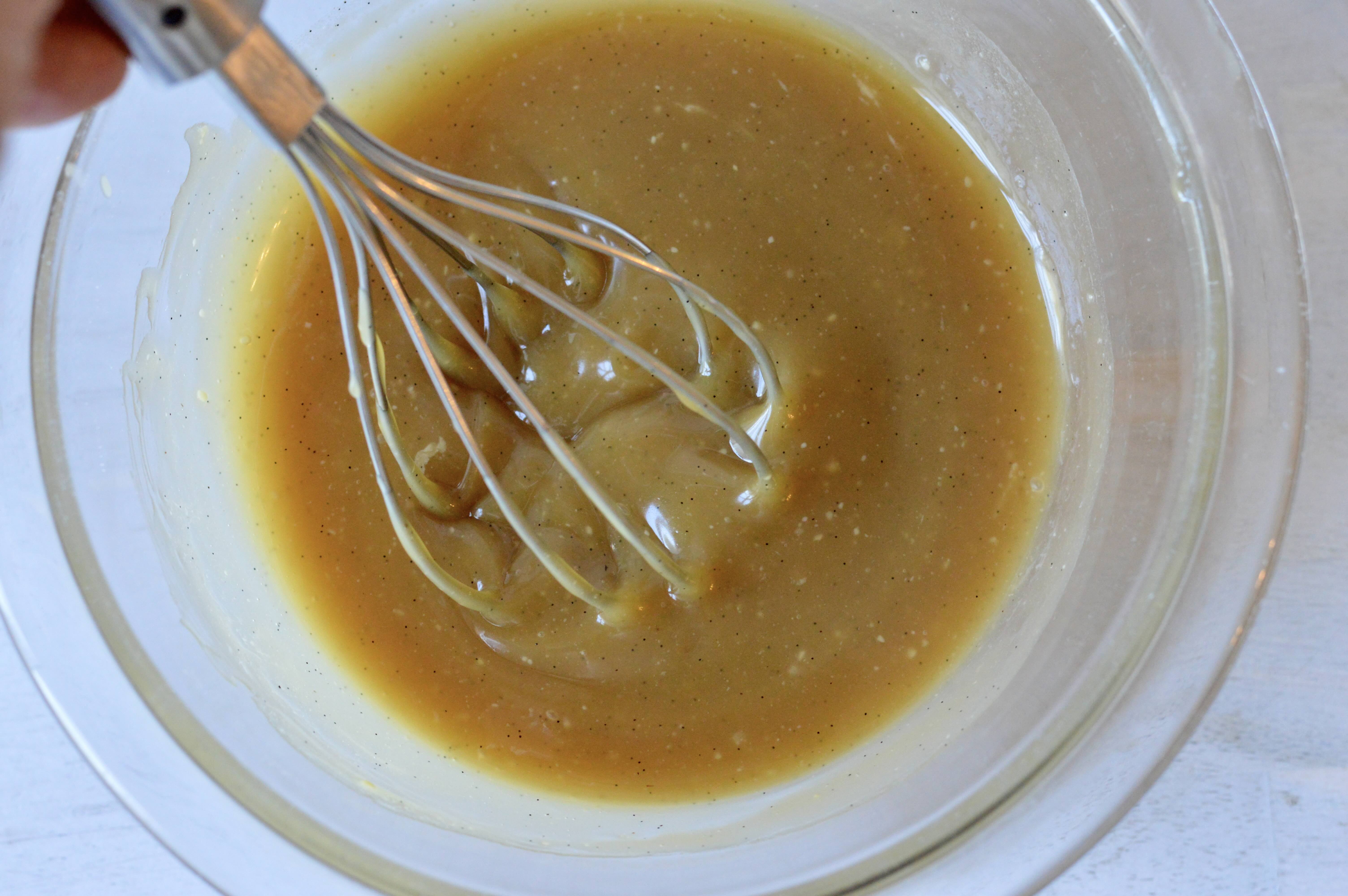 Step 1. In a small bowl, whisk the nut butter, maple syrup (or honey) & vanilla until smooth. Do not add the melted coconut oil now to avoid clumping with colder ingredients. Set aside.
