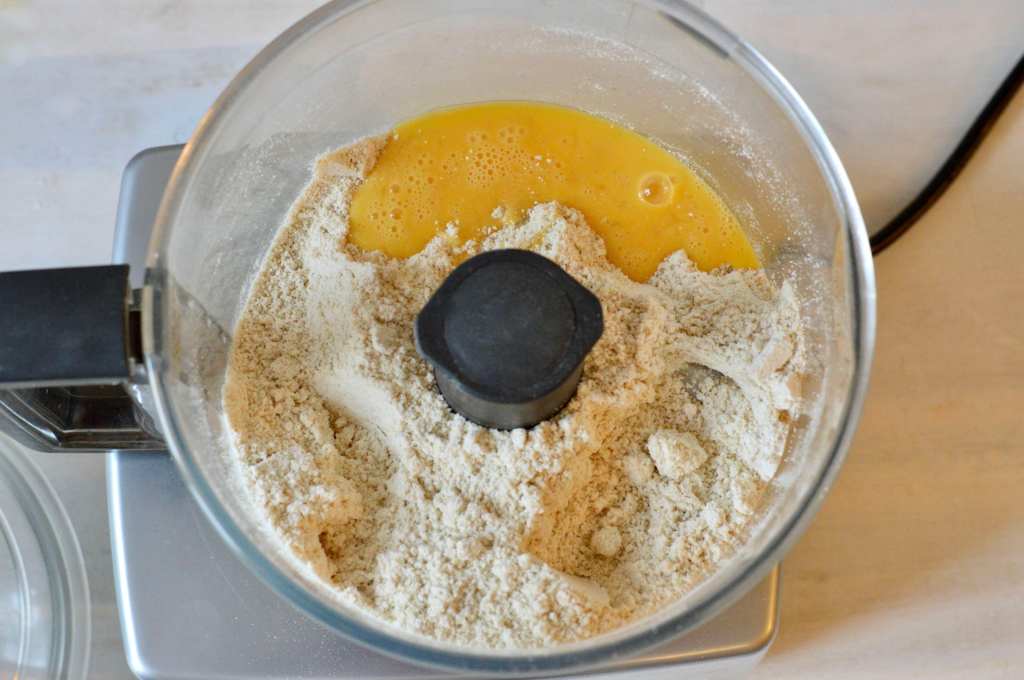 2. Meanwhile make your pie crust. In a big bowl, hand mix together the flours, salt and baking soda. Make sure that the flours are well mixed. Then transfer the flour mixture into your food processor bowl and pulse a few times to mix thoroughly. Add the whisked egg and pulse several times to combine, until the mixture looks like fine grain.