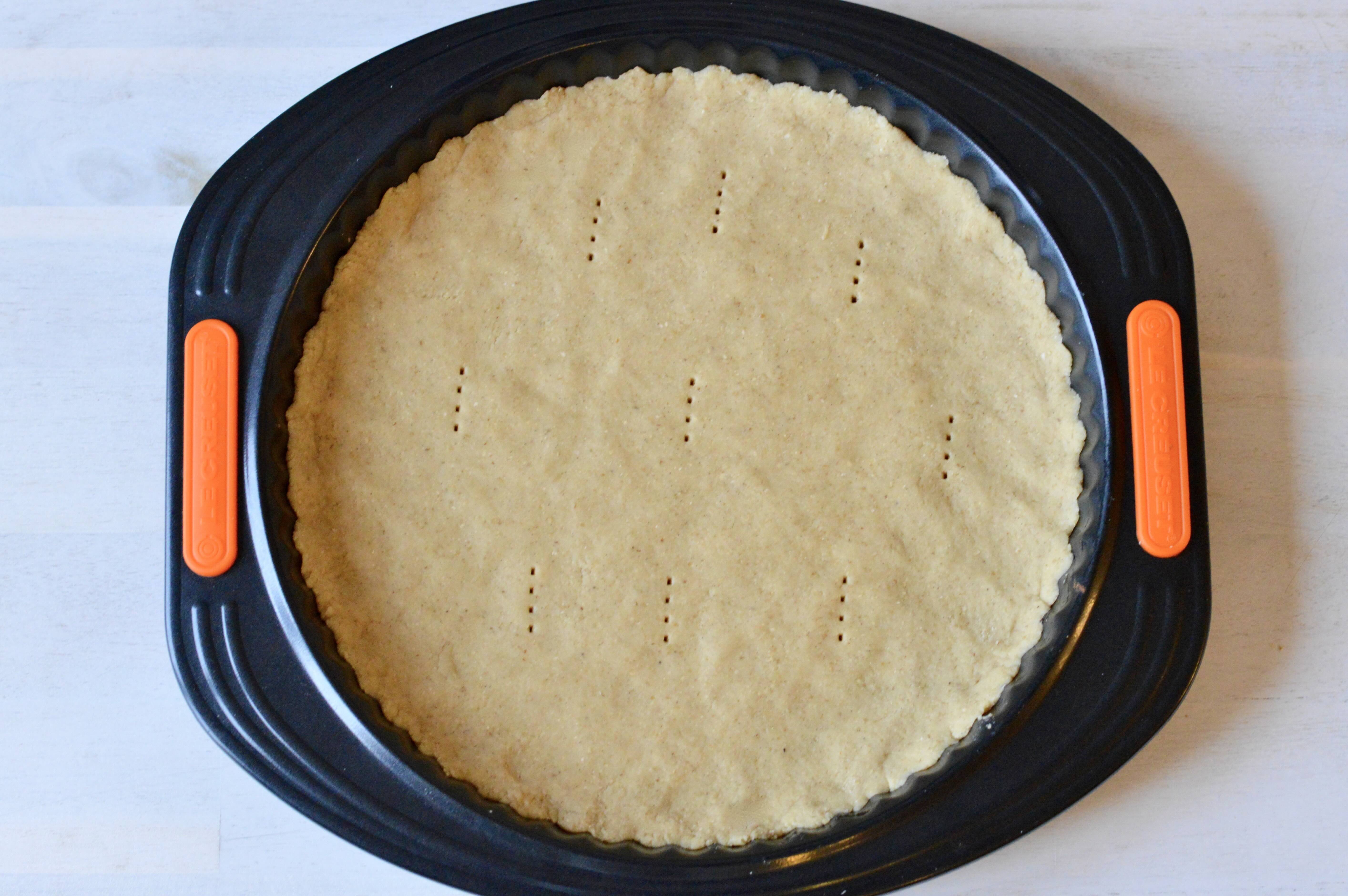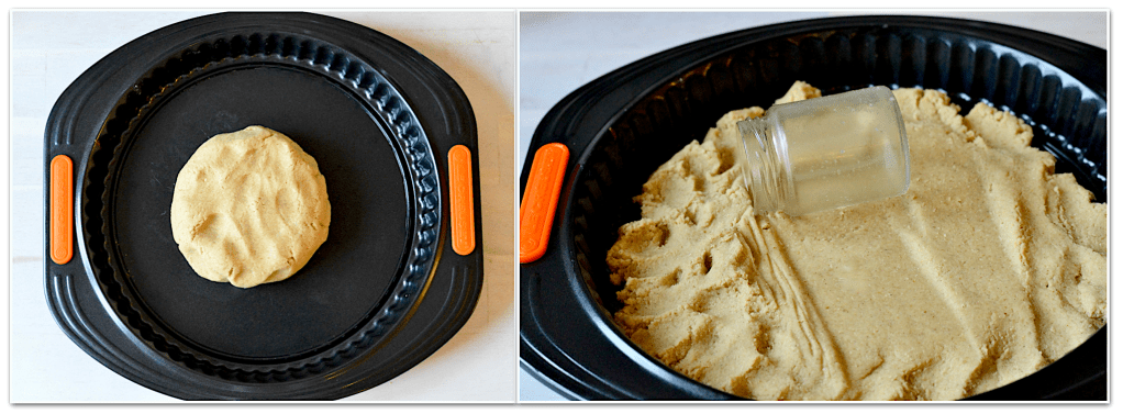 5. Scoop out the dough and shape it into an oval mass with your hands. Transfer the dough into the pie pan (lined with parchment if needed). Press it down evenly with your fingers into the pan. You can also use a small rolling pin or a glass (I used a small jar) to spread out the base. Keep pressing and spreading and create a small border on the sides. Poke holes at the base with a fork.