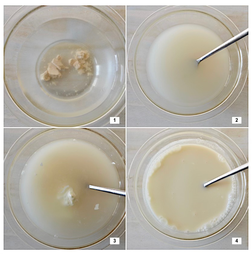 In separate medium bowl, add the yeast. Pour the water on top of the yeast and mix with fork until yeast dissolves completely. Then add the liquid honey and mix until it dissolves completely. Then add the yoghurt and stir/mix until combined.