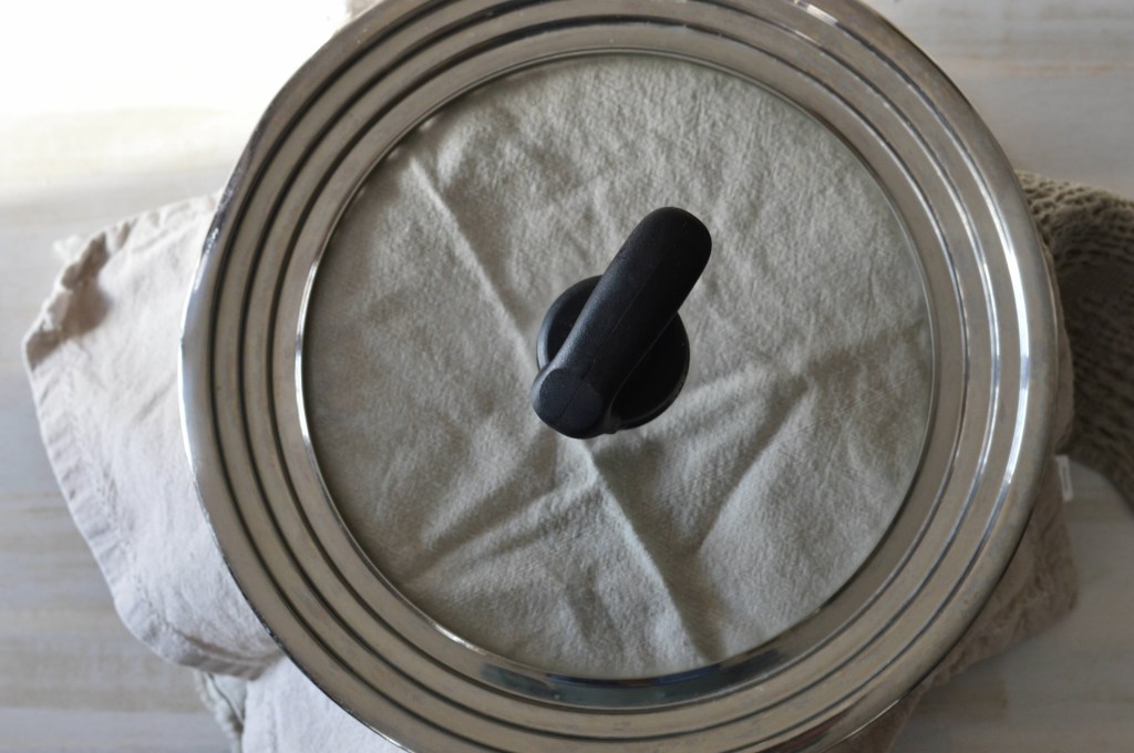 Cover the bowl with a thick tea towel and a lid or a big plate and let the dough rise for 12 to 18 hours at room temperature. Night-night dough!
